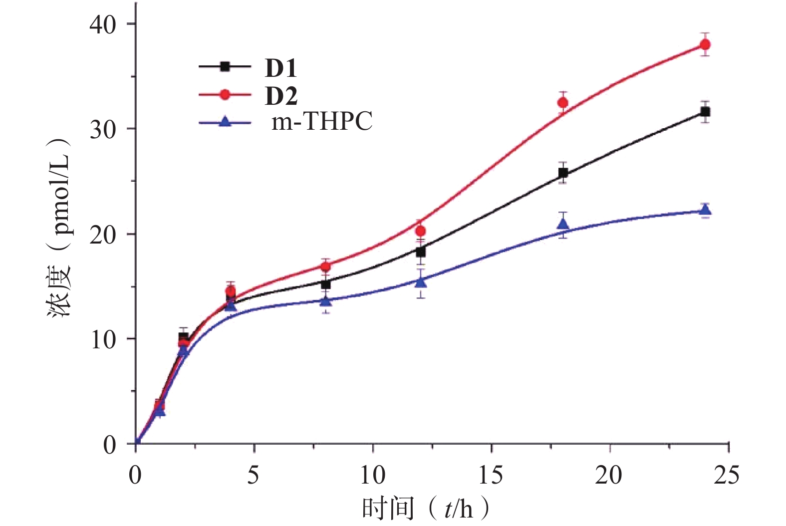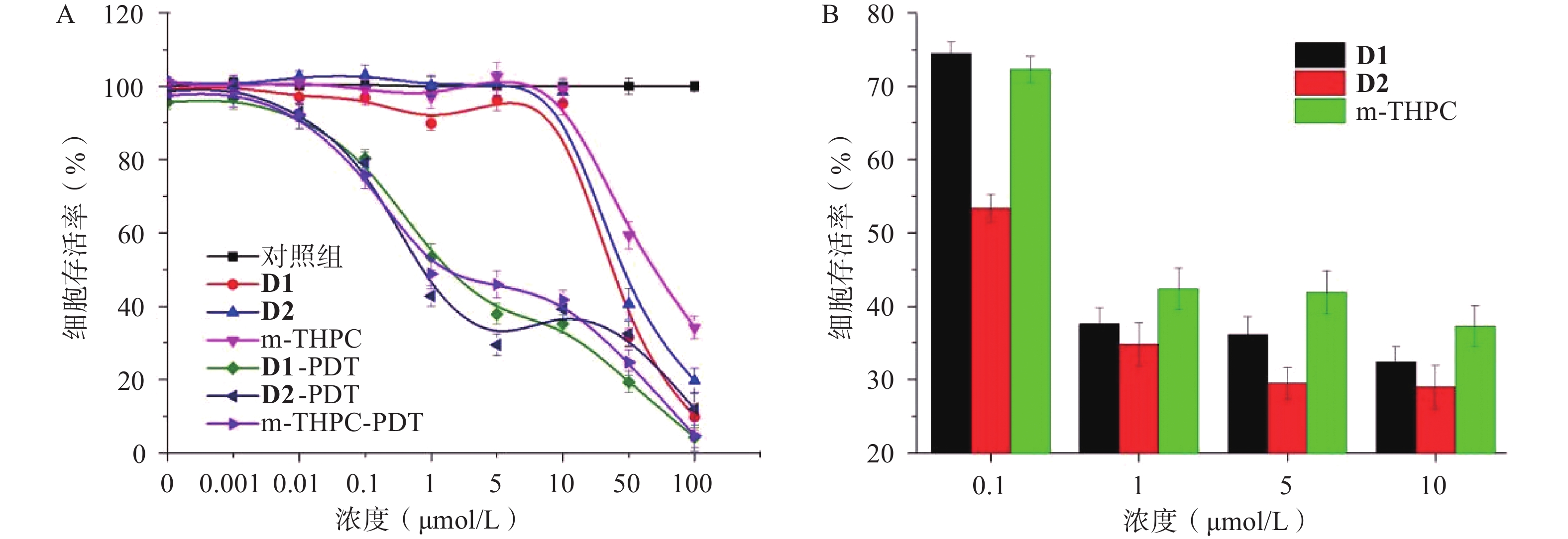 目的 研究新型二氢卟吩化合物5-(4-羧甲氧基苯基)-10,15,20-三苯基-二氢卟吩( D1 )和5-(4-羧丙氧基苯基)-10,15,20-三苯基-二氢卟吩( D2 )的光动力学性能及其介导的光动力学作用对肺癌的杀伤效果。 方法 测定新化合物 D1 和 D2 的紫外-可见吸收光谱和荧光光谱;以1,3-二苯基异苯并呋喃(DPBF)作为单线态氧捕捉剂检测 D1 和 D2 的单线态氧生成能力;利用荧光法检测化合物在人肺腺癌细胞A549内的细胞吞噬率,用MTT法检测化合物的暗毒性和光毒性;建立肺癌荷瘤裸鼠模型,考察化合物介导的光动力作用在体内的抗肿瘤活性,并进一步检测 D2 在荷瘤裸鼠体内的血药浓度以及在肿瘤组织和皮肤组织中的分布。 结果 D1 和 D2 在652 nm长波长处具有强吸收,最佳激发波长位于429 nm和427 nm处,最佳发射波长位于659 nm左右,并具有高于对照药替莫泊芬(m-THPC)的单线态氧生成速率; D1 和 D2 在10 μmol/L以下的浓度基本没有暗毒性,并可被人肺腺癌细胞A549摄取,于18~24 h基本达到饱和;在650 nm波长激光照射后, D1 和 D2 在体内外均具有明显的抗肿瘤活性(P<0.01),其中,化合物 D2 在给药后可选择性地聚集于肿瘤组织,最佳治疗时间为给药后30 min内。 结论 D2 具有优秀的光动力抗肿瘤活性,并能选择性聚集于肿瘤组织,具备成为肺癌诊治光敏剂候选药物的潜力,值得进一步的研究。