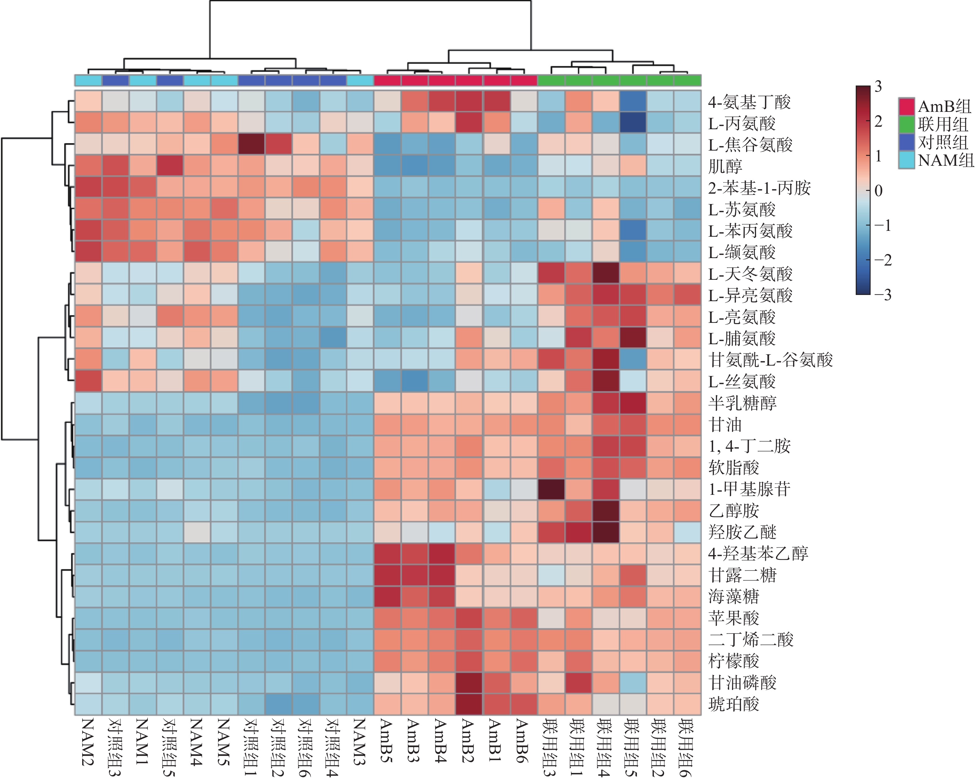 目的 基于代谢组学的方法研究烟酰胺(NAM)协同两性霉素B(AmB)抑制白念珠菌的潜在作用机制。 方法 分别使用适当浓度的NAM、AmB单独处理和二者联用处理浮游型白念珠菌,再基于气相色谱-质谱联用技术分析其胞内代谢物,通过多元统计分析筛选差异代谢物,并用NIST数据库进行检索鉴定。 结果 与对照组相比,NAM单独干预组与之分离趋势不明显,而AmB组、联用组与之具有明显的分离趋势。AmB干预后有23个代谢物发生显著性变化,NAM+AmB联合干预后有28个代谢物发生显著性变化,包括氨基酸、有机酸、多胺、糖类等成分。 结论 NAM是白念珠菌的内源性代谢物,其与AmB联用后可增强AmB在原代谢通路中的作用,同时一定程度上改变了其作用途径,推测NAM与AmB联用后可能通过调整白念珠菌的三羧酸循环、干扰其氨基酸代谢、影响多胺的合成等途径来发挥其对AmB的增效作用。