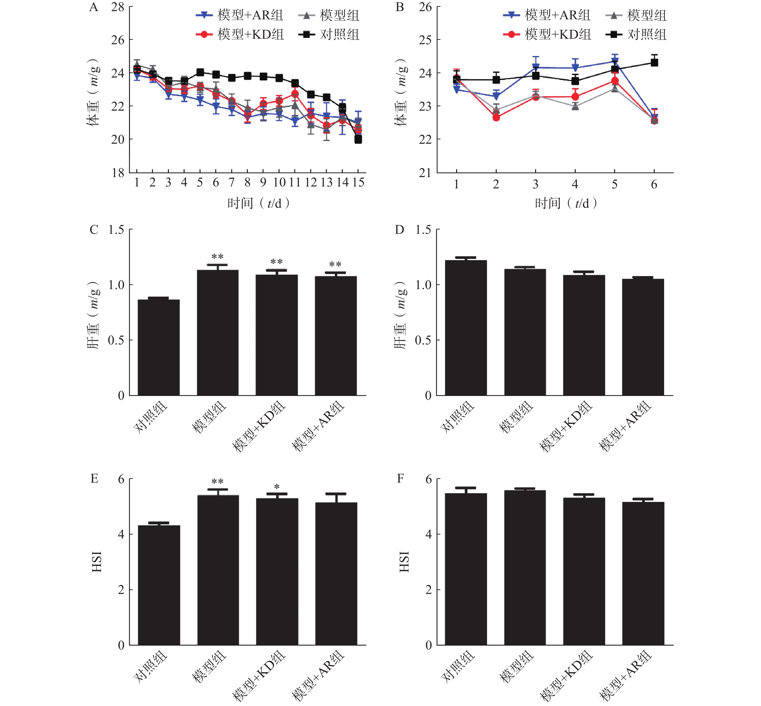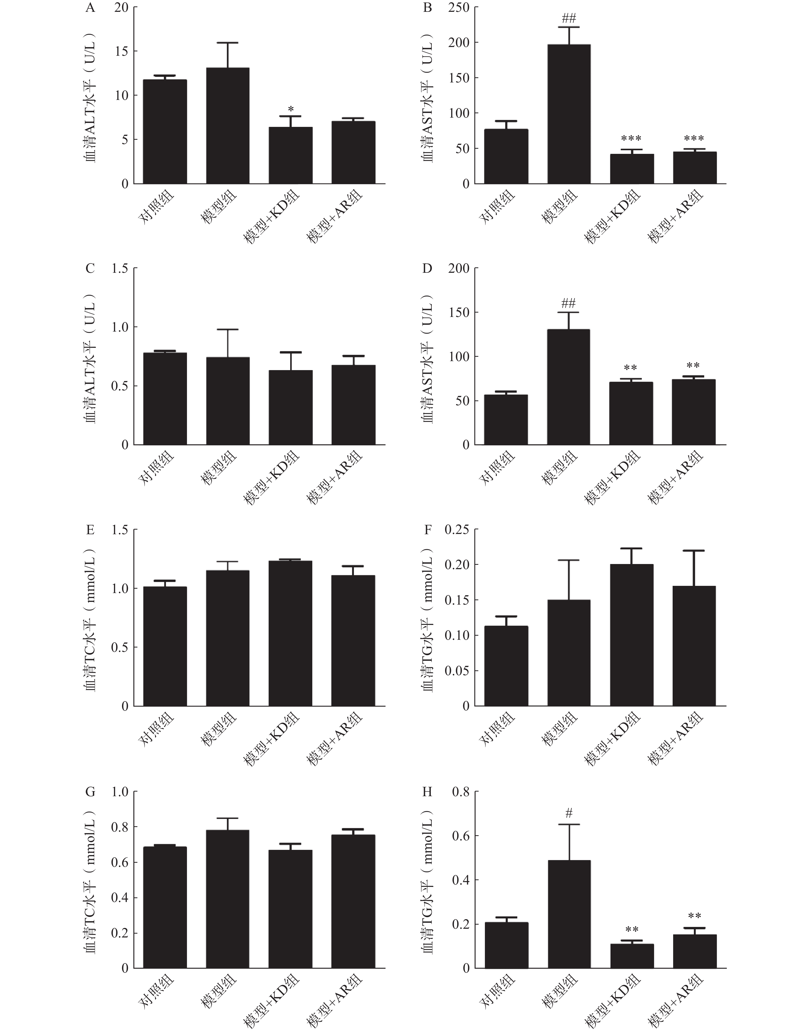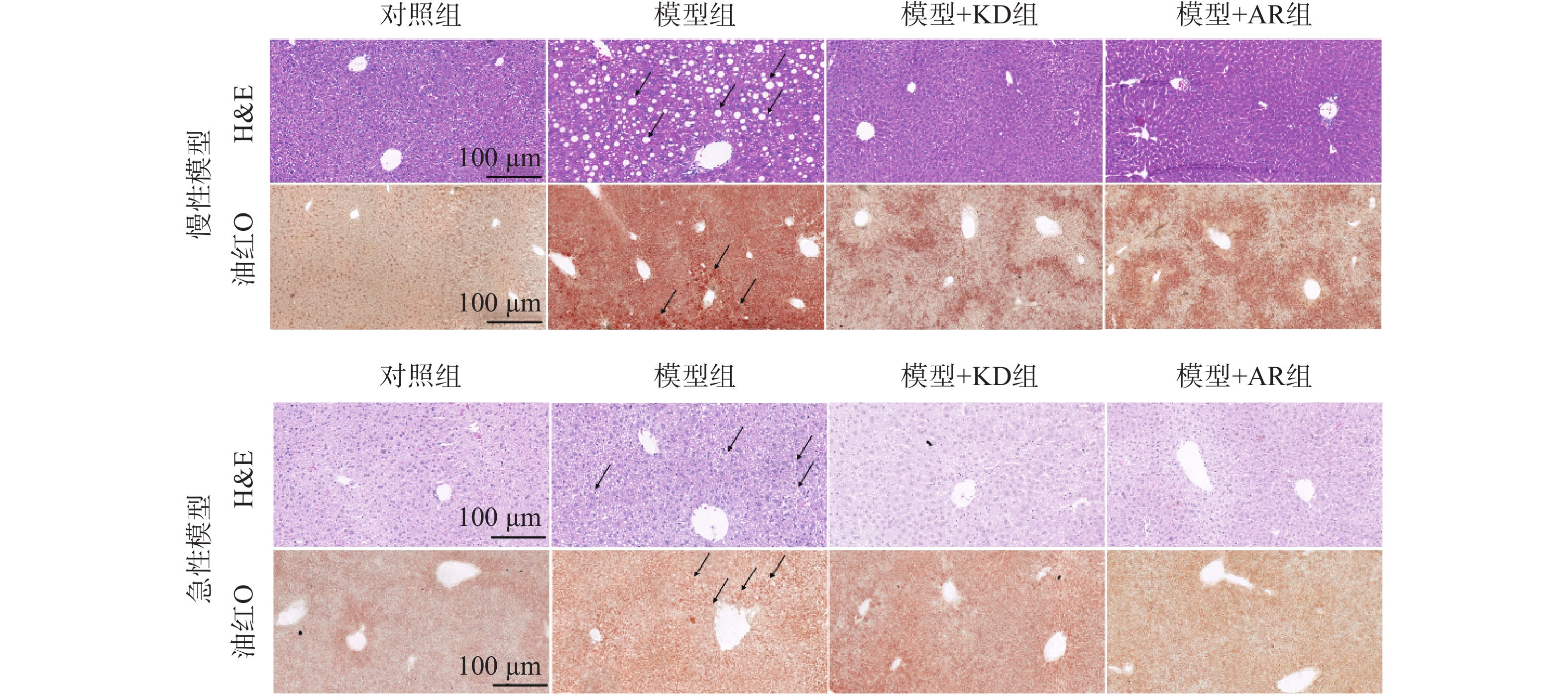 目的 该研究在小鼠慢性和急性酒精性肝损伤模型上,探讨金线莲 (Anoectochilus roxburghii, AR)有效成分金线莲苷(kinsenoside, KD)对酒精性肝损伤的保护作用及机制,为酒精性肝损伤的药物开发提供理论基础。 方法 分别建立小鼠慢性和急性酒精性肝损伤模型,通过灌胃给药分别给予金线莲和金线莲苷处理,期间每日记录体重变化;实验终点测定肝指数、分析血清中肝损伤相关因子(丙氨酸转氨酶、天冬氨酸转氨酶)和血脂水平(甘油三酯、胆固醇),结合肝脏组织病理学染色分析肝损伤情况;通过对脂质代谢关键因子-过氧化物酶体增殖物激活受体 α(PPARα)和固醇调节元件结合蛋白 1(SREBP1)的表达检测,探索金线莲苷发挥作用的潜在机制。 结果 金线莲苷在两种酒精性肝损伤模型中均显著改善肝脏空泡化和脂质沉积。在小鼠慢性酒精性肝损伤模型中,经KD和AR治疗后,丙氨酸氨基转移酶(alanine aminotransferase,ALT)和天门冬氨酸氨基转移酶(aspartate aminotransferase,AST)显著降低(P<0.05, P<0.001);KD和AR治疗后SREBP1的转录活性显著降低(P<0.01, P<0.05)。急性酒精性肝损伤模型中,KD和AR治疗后AST均显著降低(P<0.01, P<0.01),且TG水平明显下降(P<0.01, P<0.01)。 结论 KD作为AR的主要活性成分,在小鼠保肝护肝中发挥主要作用。KD可明显缓解慢性和急性酒精性肝损伤,减轻肝组织的脂质沉积;KD通过增加PPARα促进脂质分解,抑制SREBP1表达,减少脂质的合成积累,从而发挥调节脂代谢的作用,提示KD作为AR的有效成分,是一种潜在的治疗酒精性肝病(alcoholic liver disease, ALD)的药物。