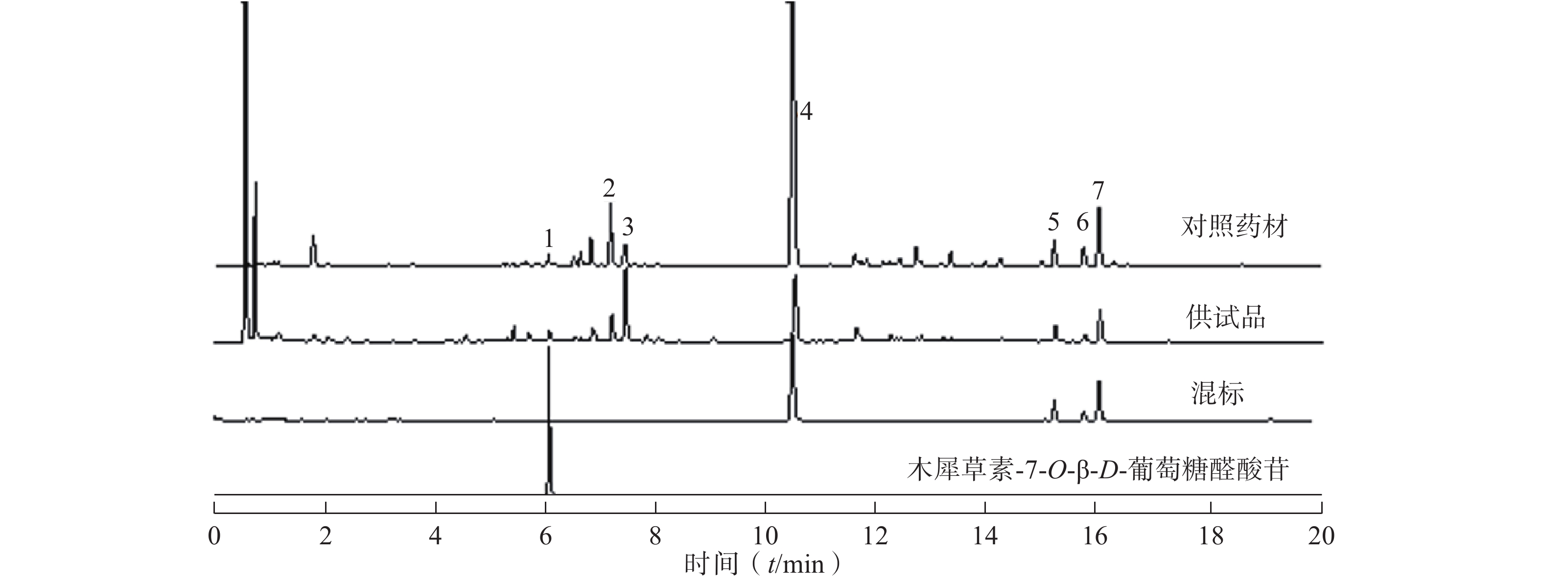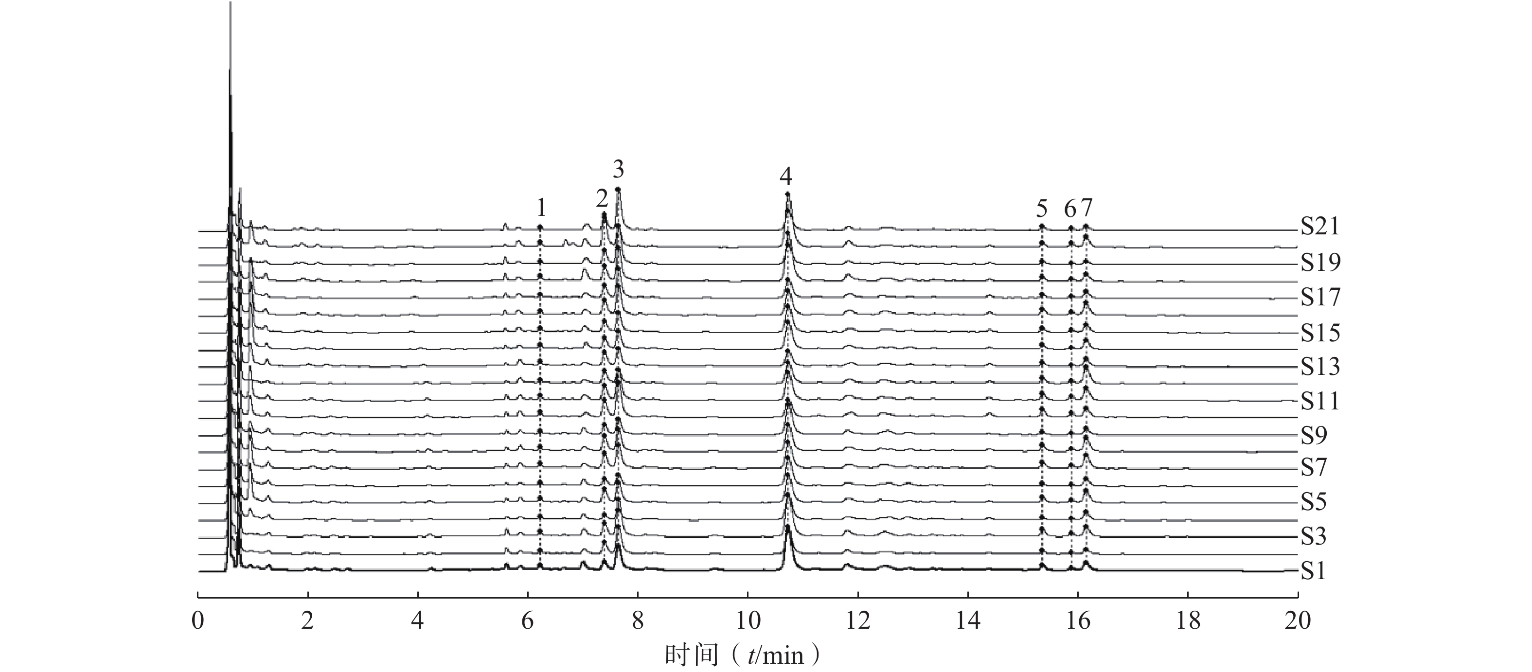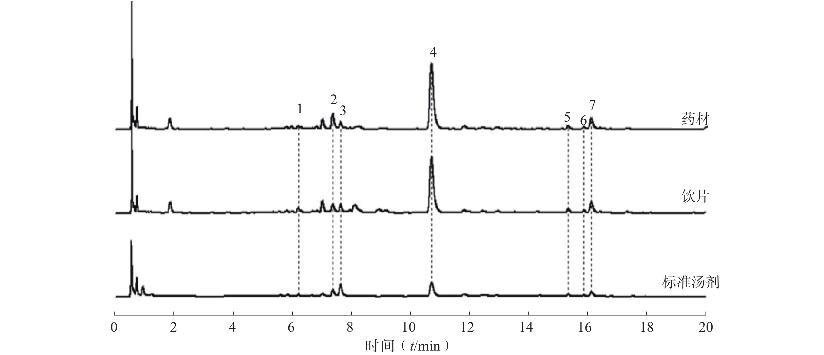 目的 采用UPLC法建立穿心莲标准汤剂的质量评价方法。 方法 依照中药饮片标准汤剂制备要求,制备21批穿心莲饮片标准汤剂,建立超高效液相特征图谱分析方法,以穿心莲内酯为参照,建立新穿心莲内酯、14-去氧穿心莲内酯和脱水穿心莲内酯的一测多评法,并与外标法测定结果比较。 结果 采用《中药色谱指纹图谱相似度评价系统(2012版)》软件进行特征图谱分析,共标定7个共有峰,指认了木犀草素-7-O-β-D-葡萄糖醛酸苷、穿心莲内酯、新穿心莲内酯、14-去氧穿心莲内酯和脱水穿心莲内酯5个成分,一测多评法与外标法测定各成分含量结果RSD均在3%以内。 结论 所建立的特征图谱和一测多评方法准确、可靠,可较全面地反映穿心莲标准汤剂的内在质量,为穿心莲配方颗粒及其他制剂的质量评价提供依据。