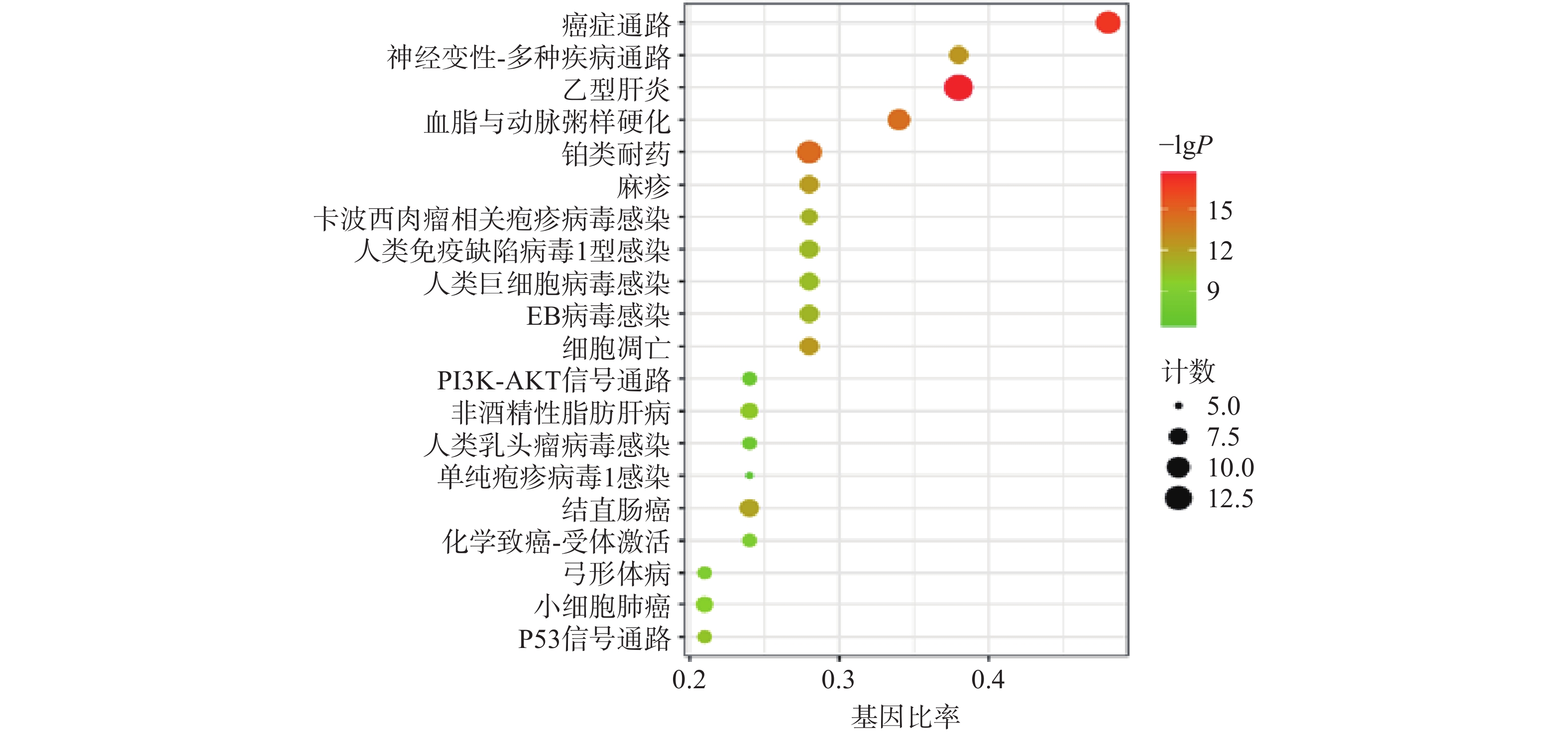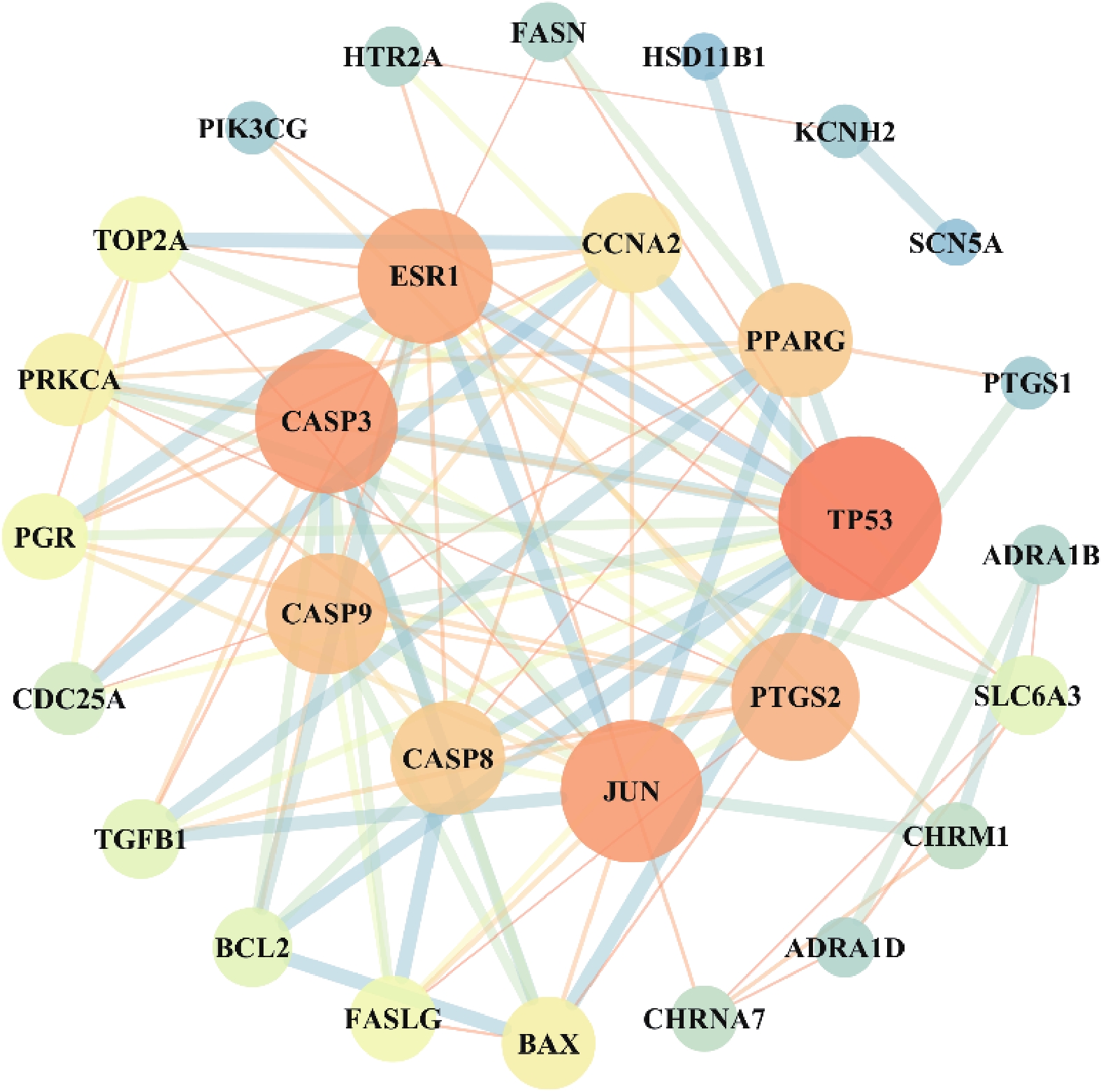 目的 利用网络药理学和分子对接技术,预测路路通治疗肿瘤的活性成分和可能的分子机制。 方法 运用TCMSP数据库和文献挖掘获取路路通的活性成分,通过SwissTarget Prediction预测活性成分的靶点。利用Gene Cards、OMIM、TTD、Drug Bank数据库筛选肿瘤相关靶点,取交集后获得路路通与肿瘤的共同靶点。通过String数据库结合Cytoscape软件构建PPI网络,筛选路路通治疗肿瘤的关键靶点。再通过Metascape平台对关键靶点进行GO和KEGG富集分析,并利用Cytoscape构建“成分-靶点-通路”网络图。通过Auto Dock Vina软件对路路通活性成分和关键靶点进行分子对接验证。 结果 筛选得到6个路路通活性成分,匹配分析筛选后得到抗肿瘤作用相关靶点29个;网络分析结果表明,路路通可通过TP53、JUN、CASP3、ESR1、PTGS2、CASP9、CASP8、PPARG等关键靶点发挥抗癌作用;KEGG富集分析关键靶点主要被富集在癌症通路、细胞凋亡通路、PI3K-Akt信号通路、大肠癌通路、小细胞肺癌通路、P53信号通路等相关通路,涉及细胞对有机环状物的反应、细胞凋亡信号通路和造血等生物学过程;分子对接验证显示核心靶点与活性成分都能较好结合,结合最好的是PTGS2-环氧异苯乙烯。 结论 该研究初步揭示了路路通通过多成分、多靶点、多通路发挥抗肿瘤作用,为后续的实验研究提供了新的思路和方向。