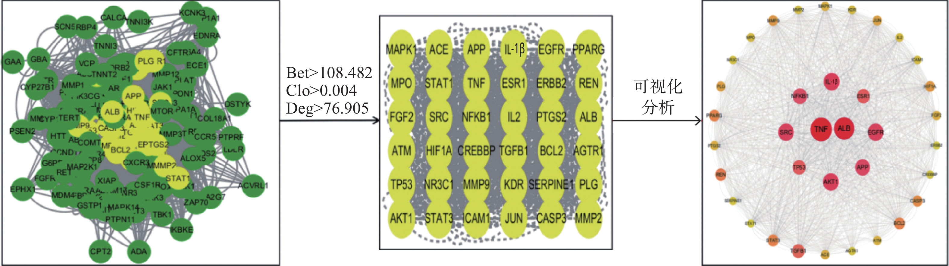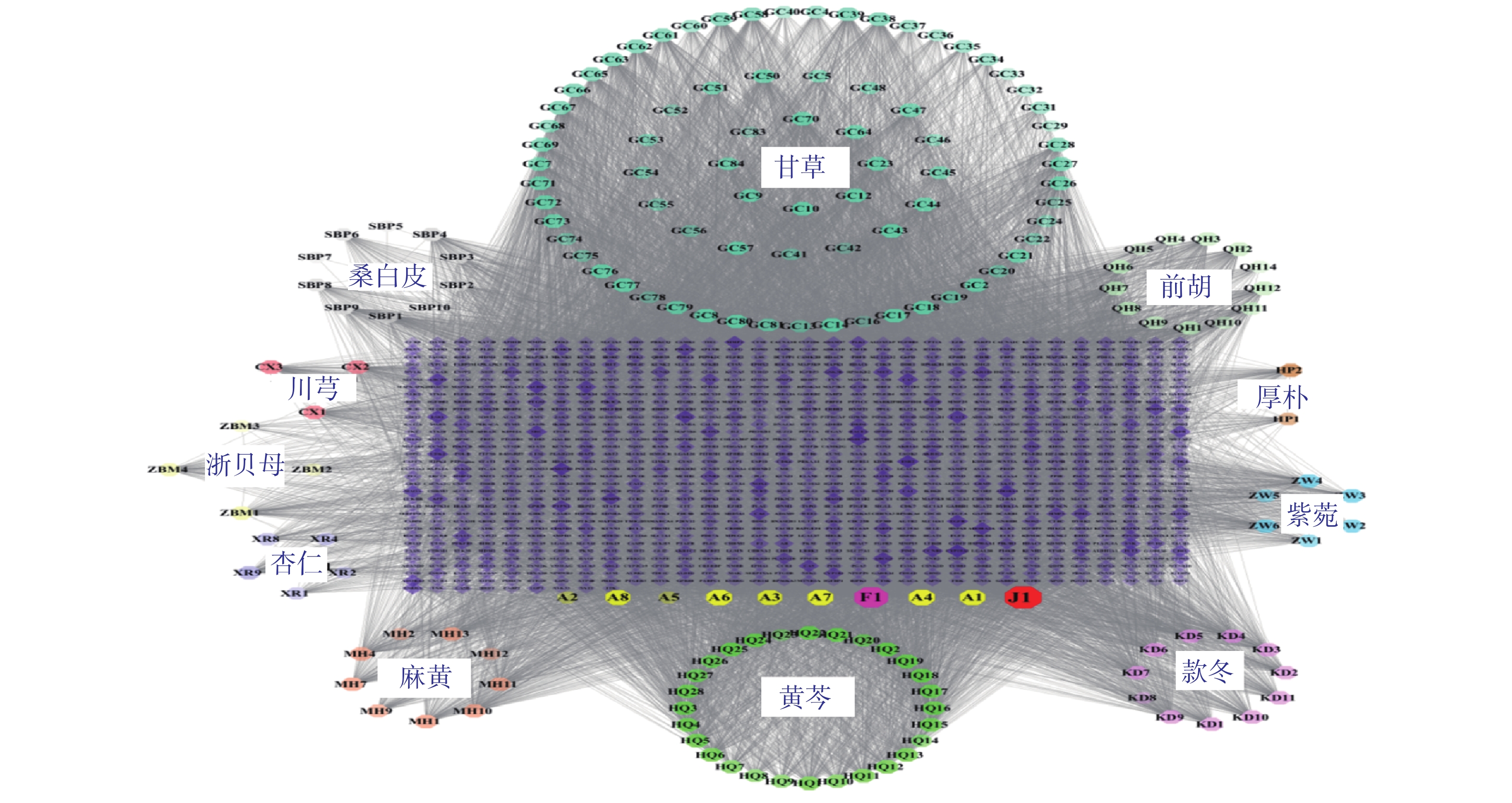 目的 探讨桑麻杏贝汤治疗慢性阻塞性肺疾病急性加重期(acute exacerbation of chronic obstructive pulmonary disease,AECOPD)的机制。 方法 检索中药系统药理学数据库与分析平台(TCMSP)、TCMID数据库中桑麻杏贝汤的活性成分,利用SwissTargetPrediction数据库预测活性成分的靶点,利用GeneCards、OMIM数据库检索AECOPD相关靶点;构建药物-活性成分-靶点网络和蛋白相互作用网络,利用DAVID数据库进行GO富集和KEGG通路富集分析,通过AutoDock Tools软件进行分子对接,通过动物实验进行验证。 结果 得到桑麻杏贝汤活性成分192个,预测1 066个靶点,网络分析表明,桑麻杏贝汤排名前3位的活性成分为槲皮素、山柰酚、光甘草定,治疗靶点前3位的是肿瘤坏死因子(tumor necrosis factor,TNF)、白蛋白(albumin,ALB)和白细胞介素-1β( interleukin-1β,IL-1β)。GO与KEGG分析表明,主要通路为癌症通路、丝裂原活化蛋白激酶(mitogen-activated protein kinase,MAPK)信号通路、磷脂酰肌醇3-激酶-蛋白激酶B信号通路(phosphatidylinositol 3-kinase-protein kinase B,PI3K-Akt)信号通路。分子对接结果显示,光甘草定与苏氨酸蛋白激酶(threonine-protein kinase,AKT1)、白细胞介素-1β、表皮生长因子受体(epidermal growth factor receptor,EGFR)以及肉瘤相关激酶(sarcoma,SRC)均具有良好的结合活性,结合能均低于−5 kcal·mol。此外,槲皮素和山柰酚亦与IL-1β表现出较强的结合能力,结合能同样低于−5 kcal·mol。动物实验证明,桑麻杏贝汤可通过抗炎、减少肺组织结构变化治疗AECOPD,并可降低TNF-α、IL-6、IL-8血清炎症水平。 结论 桑麻杏贝汤可能作用于AKT1、IL-1β、EGFR、SRC等靶点,通过调控PI3K/Akt信号通路、MAPK信号通路、癌症通路等作用途径减少TNF-α、IL-6、IL-8血清炎症水平,改善肺组织结构与炎症反应,实现对AECOPD的治疗作用。