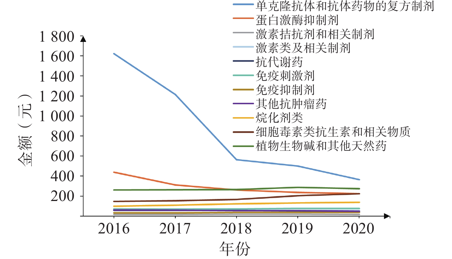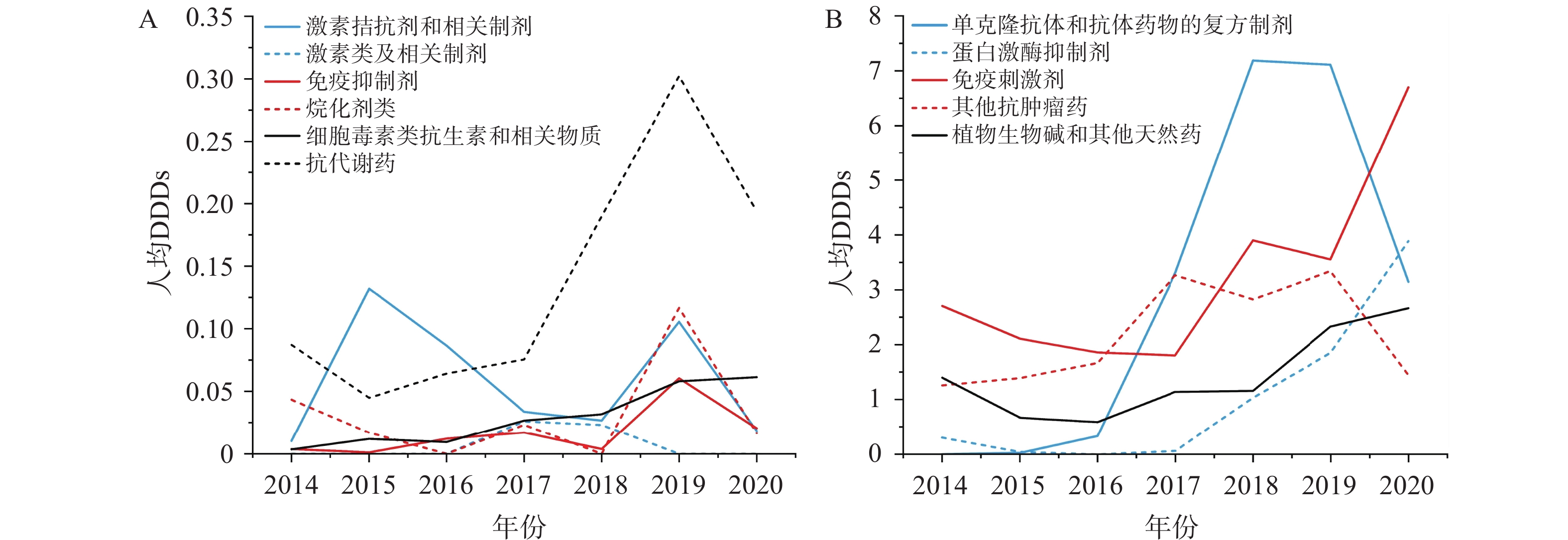 目的 比较和分析肺癌治疗药物在国家启动医保谈判前后的使用变化情况,研究一系列政策对肺癌用药的影响。 方法 运用描述性统计方法,分析北京大学人民医院2014−2020年肺癌患者的基本情况和治疗药物的变化趋势,并结合全国医药信息网中肺癌治疗药物的医院采购数据进行综合分析。 结果 2014−2020年肺癌患者人均总费用整体呈现先上升后下降趋势,在国家药品医保谈判前不断增长,谈判后逐步降低。2017年之后,血管内皮生长因子/血管内皮生长因子受体(VEGF/VEGFR)抑制剂和表皮生长因子受体(EGFR)酪氨酸激酶抑制剂等解剖学、治疗学及化学分类系统(ATC)小类用量明显增加,单克隆抗体品种数也在增多。奥希替尼、安罗替尼、阿来替尼、克唑替尼等医保目录药品的用药频度(DDDs)上升趋势明显,日均费用明显降低。 结论 近年来,肺癌患者住院天数持续缩短,用药结构发生显著变化。国家医保目录的调整使更多的肺癌创新药呈现“量升价降”趋势。
