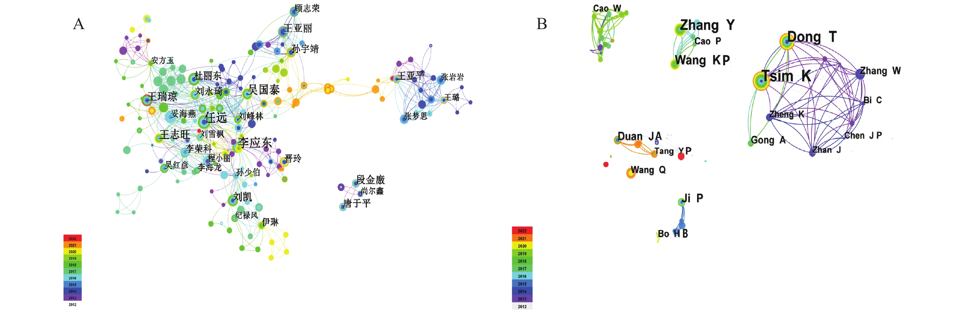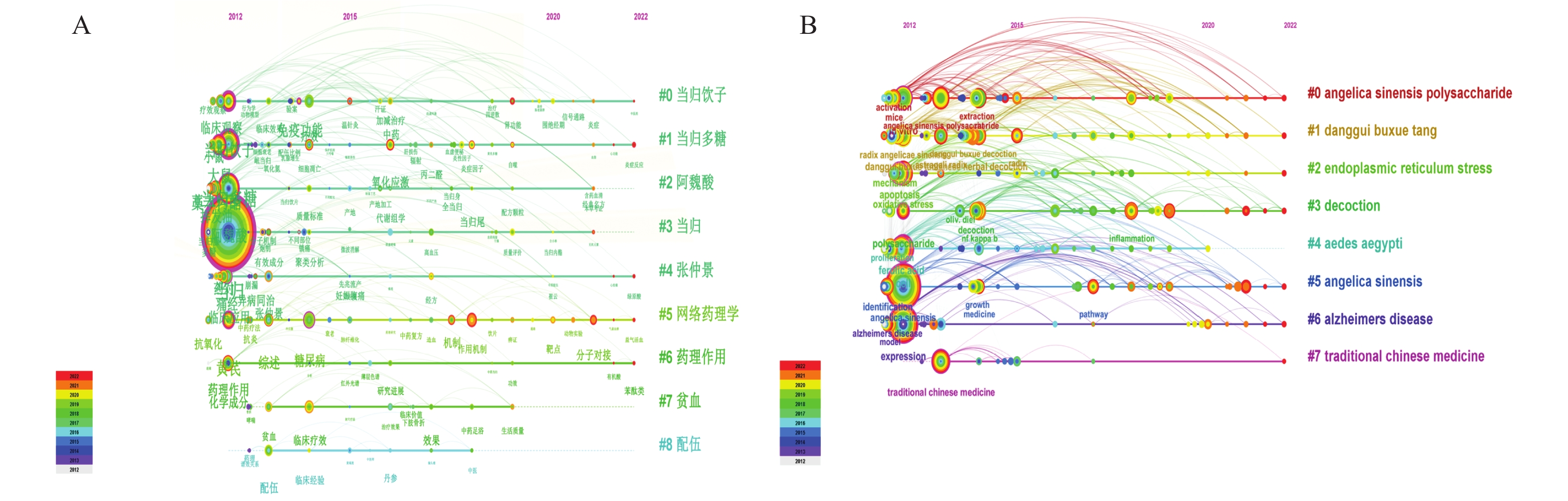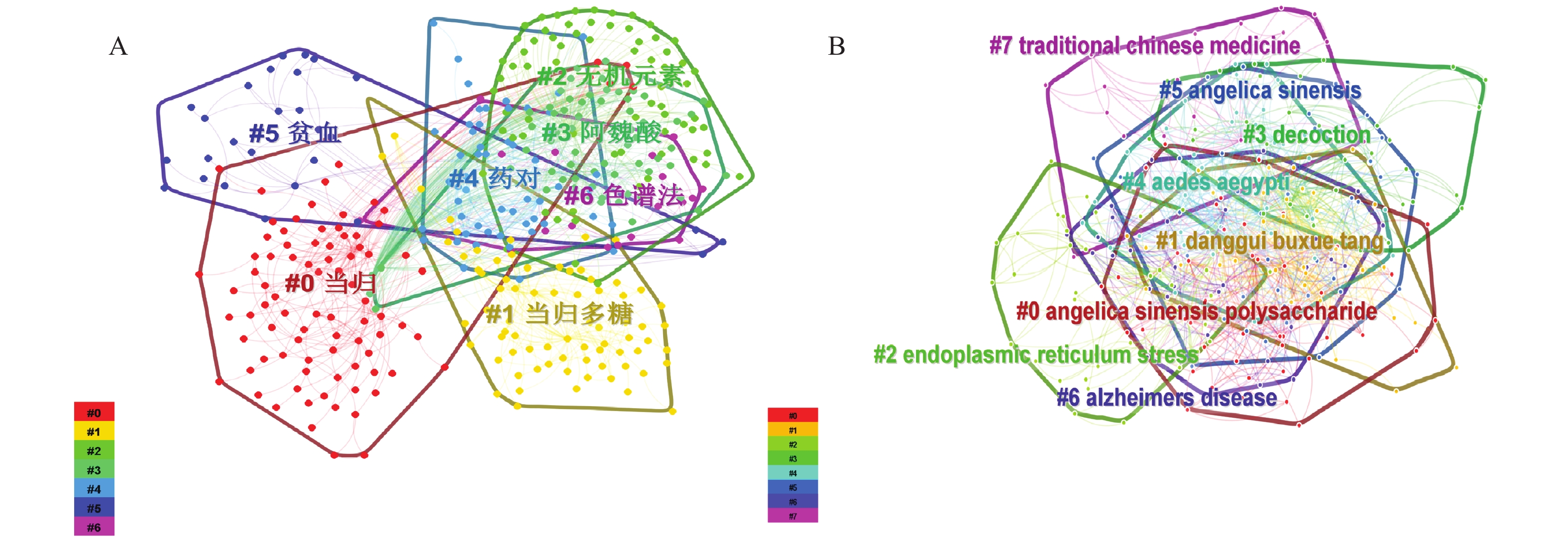 目的 基于可视化图谱分析当归的研究热点,预测未来的研究趋势,为当归下一步的研究提供参考。 方法 检索中国知网(CNKI)、万方(WanFang)、维普(VIP)和Web of Science数据库中2012年至2022年收录的当归中、英文相关文献,运用CiteSpace 6.1.R6软件分别从发文量、作者、机构、期刊、关键词等主题进行可视化计量分析。 结果 共纳入中文文献3490 篇,英文文献409篇。可视化知识图谱分析表明,甘肃中医药大学和南京中医药大学分别为中、英文文献发文量最多的研究机构。收录的期刊主要有《时珍国医国药》和 Evidence-based Complementary and Alternative Medicine 等。目前研究热点有:当归多糖、挥发油及阿魏酸等成分对血液系统、慢性疾病及认知障碍的改善作用;以及当归经典名方及其加减方的临床疗效评价。研究趋势体现为:聚焦于当归补血汤的药理研究,应用多种试验方法如网络药理学、血清药理学与代谢组学揭示当归的作用机制。 结论 当归及其复方药理作用广泛,药效学研究仍有待深入。