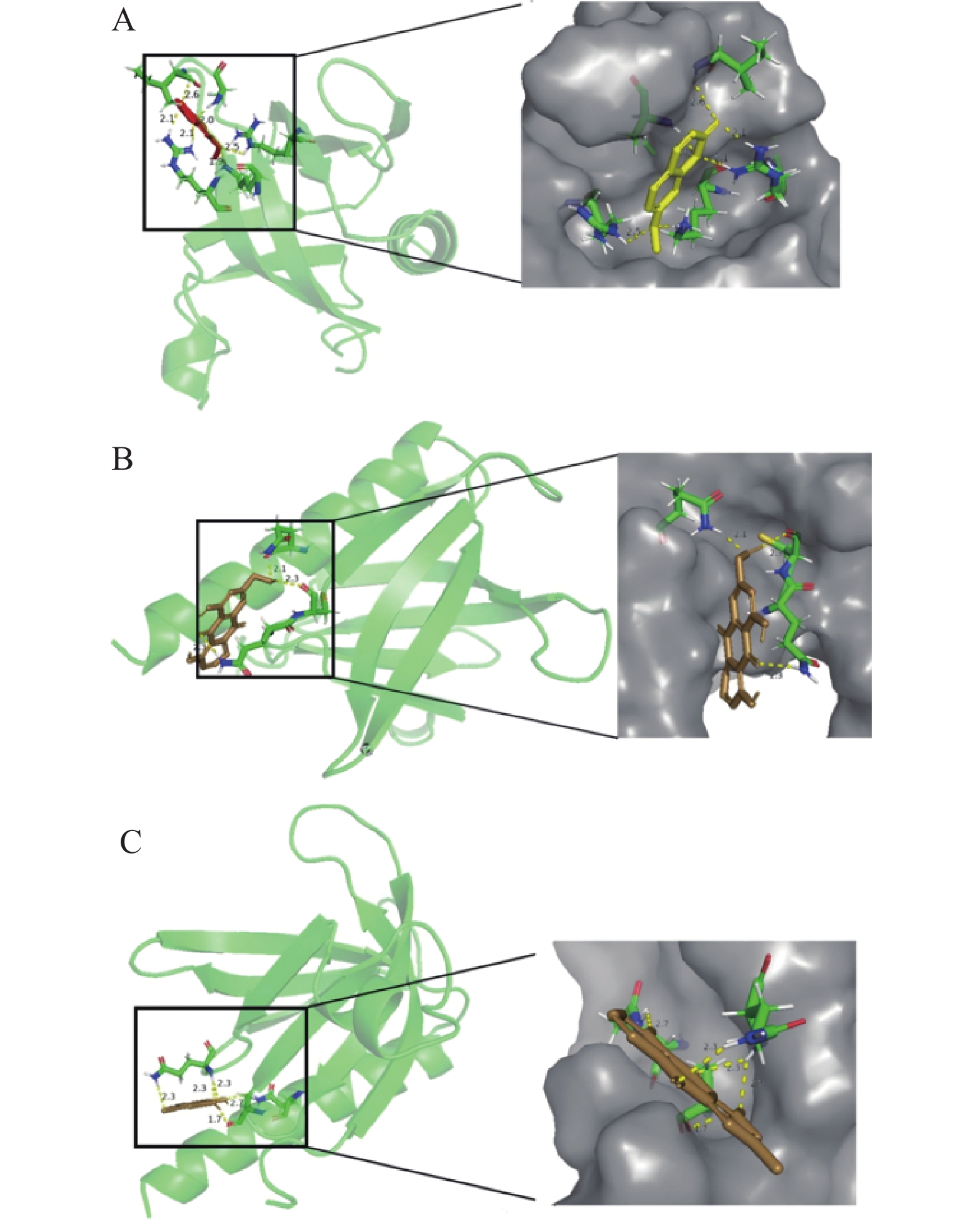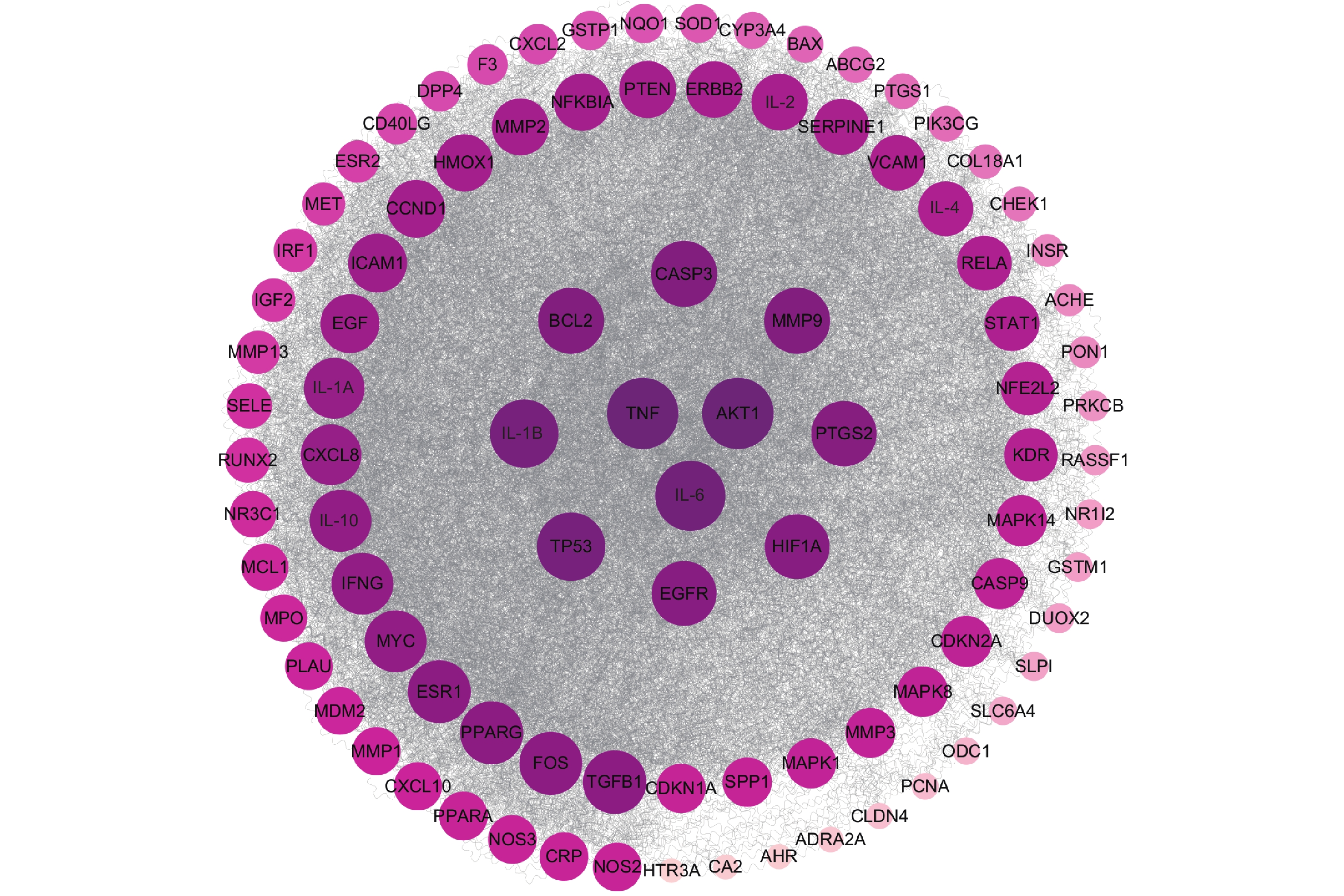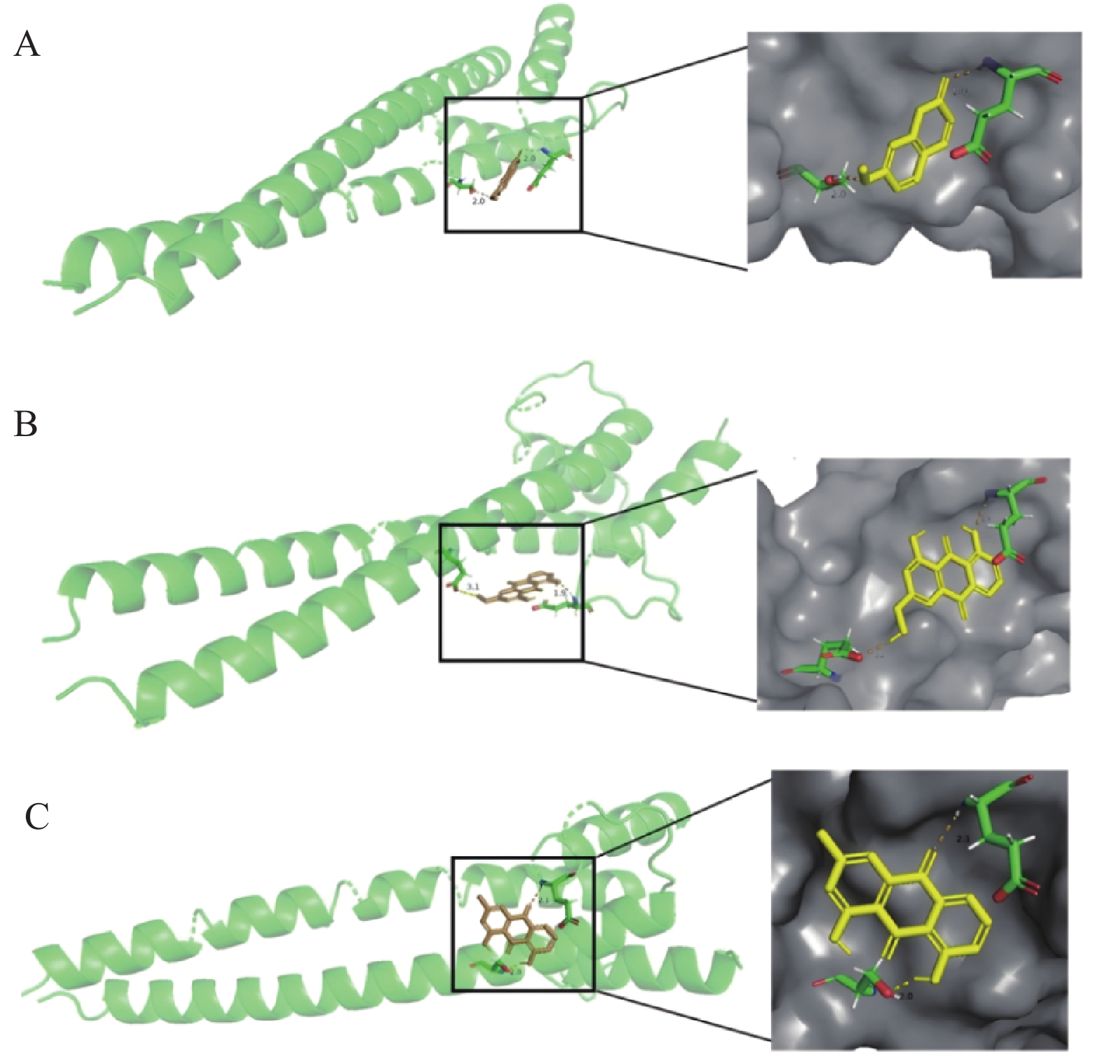 目的 利用网络药理学及分子对接技术研究愈肠颗粒治疗溃疡性结肠炎(UC)的分子机制。 方法 应用TCMSP和HIT数据库检索筛选愈肠颗粒活性成分和作用靶点,利用GeneCards、CTD和DisGeNET数据库获取UC疾病相关靶点;取二者交集靶点作为愈肠颗粒治疗UC的潜在作用靶点。应用Cytoscape 3.10.1软件构建“中药-活性成分-交集靶点”网络,获取核心活性成分。将交集靶点导入STRING数据库中进行蛋白质-蛋白质相互作用(PPI)网络分析,筛选关键靶点。应用DAVID数据库对交集靶点进行GO功能和KEGG通路富集分析,并使用微生信在线工具进行可视化分析,获取主要通路。将核心活性成分和关键靶点进行分子对接验证作用机制。 结果 研究共得到98个活性成分和 94个交集靶点,交集靶点共涉及 611 个生物过程、50 个细胞组分、104 个分子功能以及 158 条信号通路。槲皮素、木犀草素、β-谷甾醇、豆甾醇、山奈酚为核心活性成分,其中槲皮素可能为最关键的核心活性成分;肿瘤坏死因子(TNF)、丝氨酸/苏氨酸蛋白激酶1(AKT1)、肿瘤蛋白p53(TP53)、白介素-6(IL-6) 和IL-1β为关键靶点;癌症、AGE-RAGE在糖尿病并发症中的作用、脂质和动脉粥样硬化、IL-17和TNF信号通路等为主要信号通路。核心活性成分与关键靶点结合活性均良好,其中槲皮素与TNF、AKT1和TP53,豆甾醇与AKT1结合效果最好。 结论 愈肠颗粒通过多成分、多靶点、多通路发挥对UC的治疗作用。