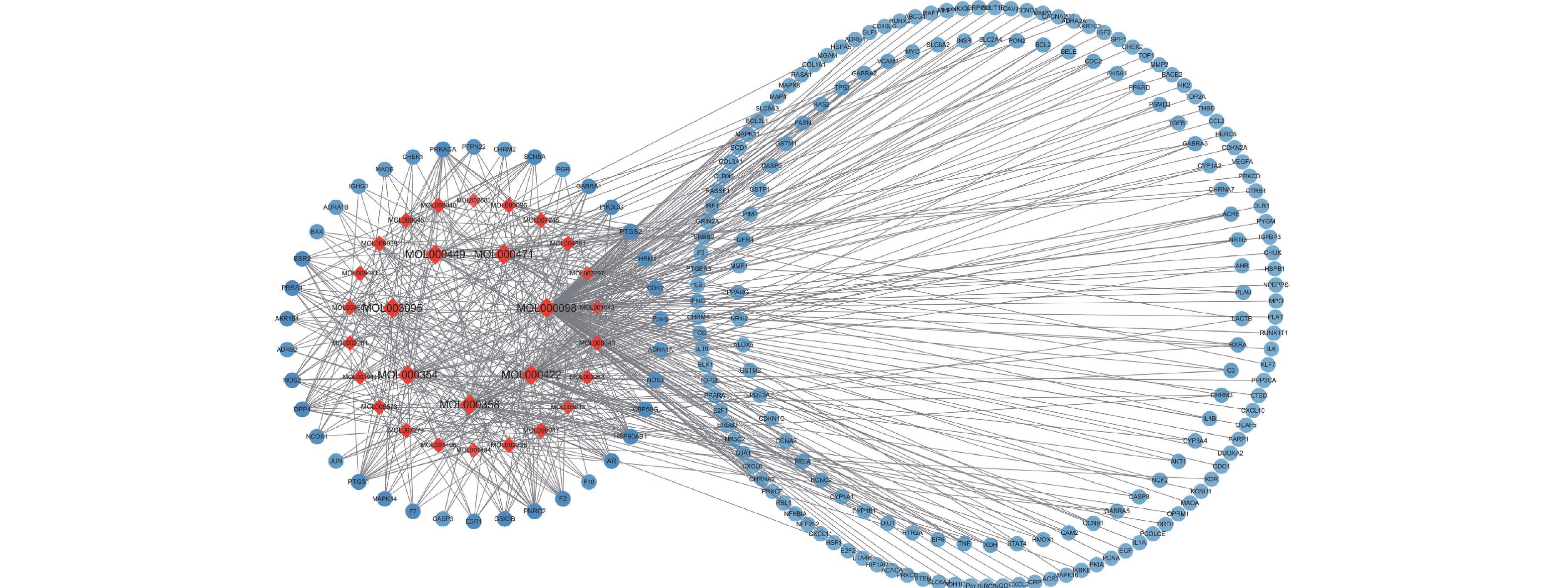 目的 完善茵陈蒿汤体内入血成分的分析,探究其抗肝癌的作用机制。 方法 采用超高效液相色谱-四极杆-飞行时间质谱技术,对单次灌胃给予茵陈蒿汤25 ml/kg(含生药0.1 g/ml) 2 h后的小鼠进行血液样本采集并分析,系统研究茵陈蒿汤在体内的化学成分。利用网络药理学方法筛选茵陈蒿汤成分及其靶点与肝癌靶点;找出茵陈蒿汤与肝癌的共同靶点进行GO通路和KEGG通路富集分析;对主要靶点进行分子对接,以验证活性成分与核心靶点结合能力。通过qPCR技术分析茵陈蒿汤水煎液及口服预防给药14 d后和未经预防给药的,刀豆蛋白A(Con-A)所致急性肝损伤小鼠以及未作任何处理的对照组小鼠的肝脏组织中丝氨酸/苏氨酸蛋白激酶1(AKT1)和肿瘤蛋白p53(TP53)的mRNA的相对表达量。 结果 ①以体外成分分析数据检索,鉴定了茵陈蒿汤入血后的活性成分。分别是大黄酚、7-甲氧基香豆素、芦荟大黄素、水晶兰苷。②利用网络药理学方法进一步分析入血成分抗肝癌的作用机制,共筛选茵陈蒿汤成分30个,靶点213个、肝癌靶点215个。③茵陈蒿汤与肝癌交集靶点17个,包括AKT1、TP53、表皮生长因子受体2(ERBB2)、骨髓细胞瘤癌基因(MYC)、白介素-1β(IL-1β)等;GO富集结果显示,这些靶点主要涉及DNA复制、染色体分离、白细胞介导的免疫、白细胞细胞间黏附等;KEGG富集结果显示,其主要涉及多种癌症通路、柠檬酸循环(TCA循环)丙酮酸代谢、p53信号通路等。④分子对接结果显示,大黄酚、7-甲氧基香豆素、芦荟大黄素与AKT1、TP53、ERBB2、MYC、IL-1β皆有较强的结合能力。⑤造模组的AKT1和TP53的mRNA相对表达量明显高于对照组,给药组的AKT1和TP53的mRNA相对表达量明显低于造模组。 结论 鉴定得到茵陈蒿汤4种入血成分,其中,大黄酚、7-甲氧基香豆素、芦荟大黄素可能作用于AKT1、TP53、ERBB2、MYC、IL-1β,进而参与调控癌症通路、p53信号通路等,是茵陈蒿汤抗肿瘤作用的潜在活性成分。