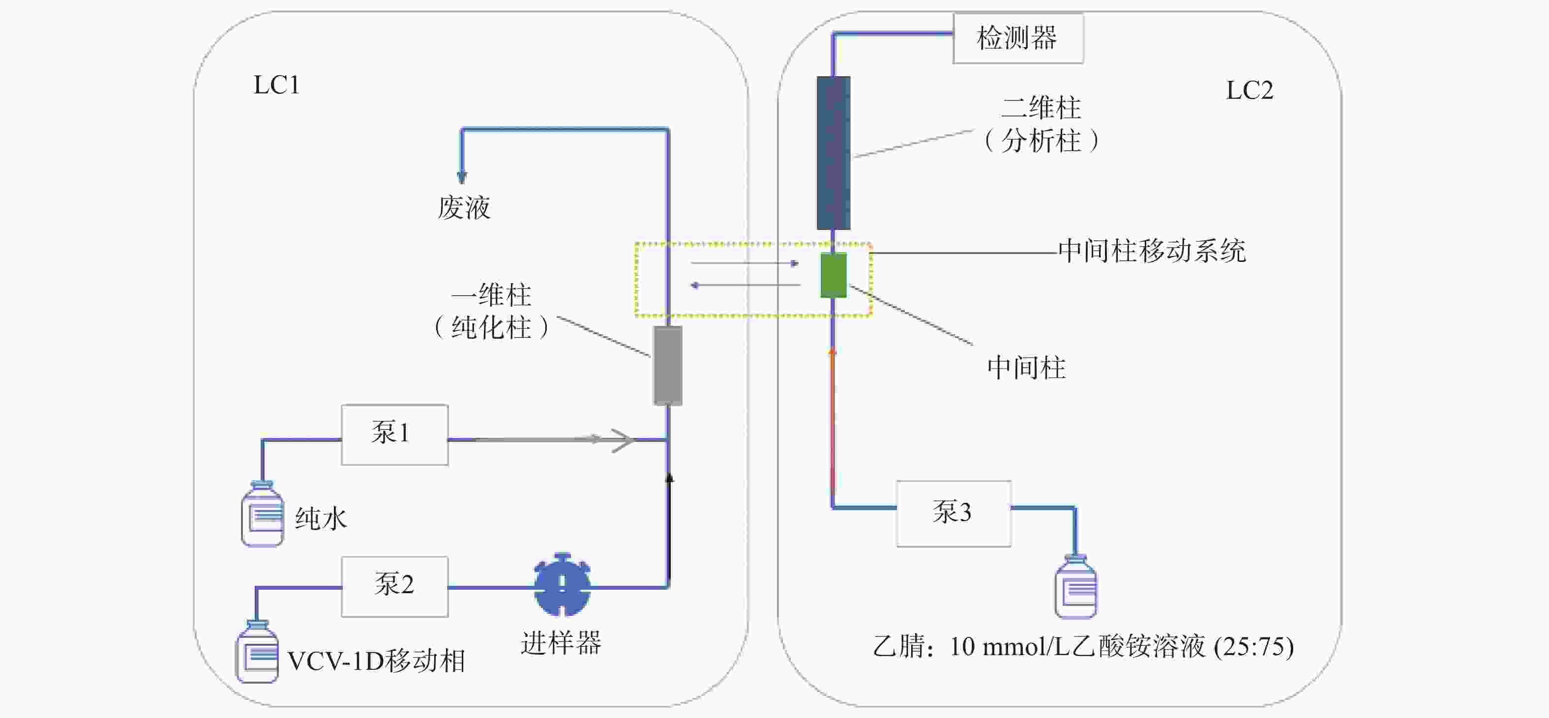 综上考虑,本研究选用色谱柱SNCB-1A、Symmetry C18作为二维液相色谱法的第一维色谱柱、第二维色谱柱,VCV-1D移动相为第一维流动相,乙腈-乙酸铵溶液为第二维流动相。