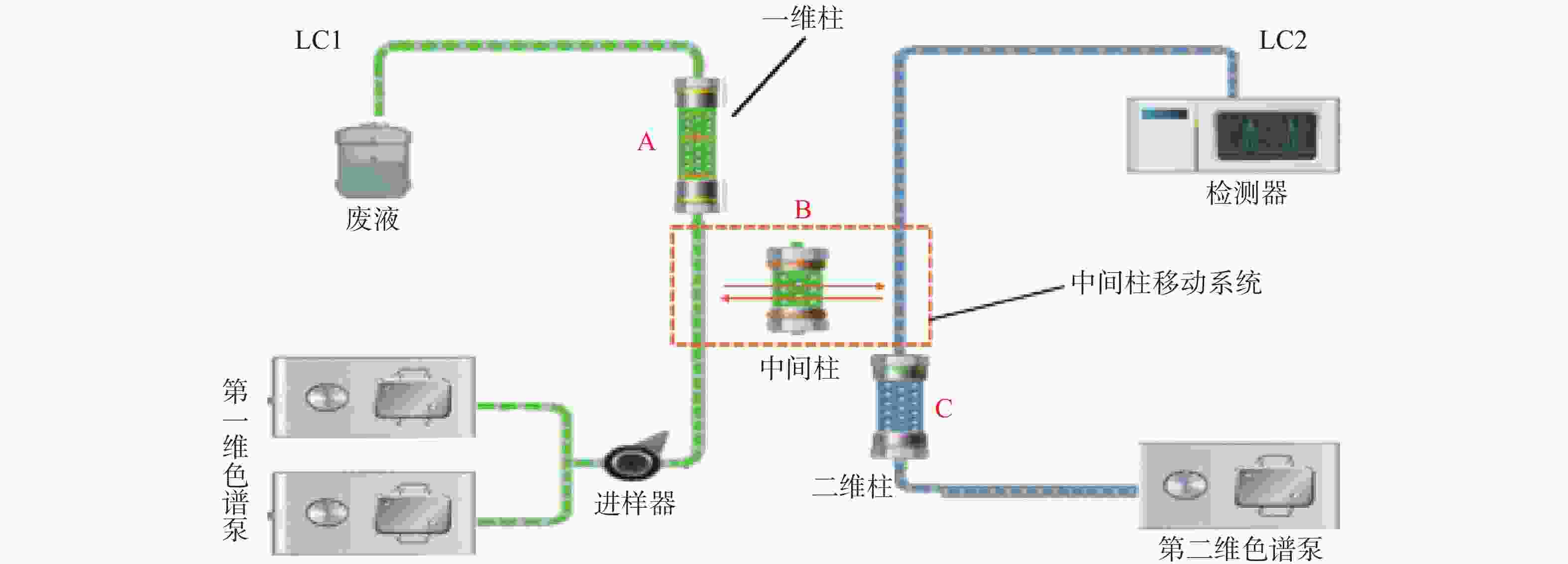 二维液相色谱将分离原理不同的两支色谱柱经一定接口和柱切换技术耦合在一起,通过加入不同的流动相进行选择性分离。样品在第一维色谱进行初步富集分离,经过纯化后将目标组分利用柱切换技术由中间柱转移系统转移到第二维中,最后目标组分在第二维色谱中分离分析。当目标组分在第二维色谱中分离分析时,纯化柱已经逐渐开始清洗,以备样品的再次进入,由此间隔不断地运行。二维液相色谱系统结构见图1;工作原理示意图见图2。