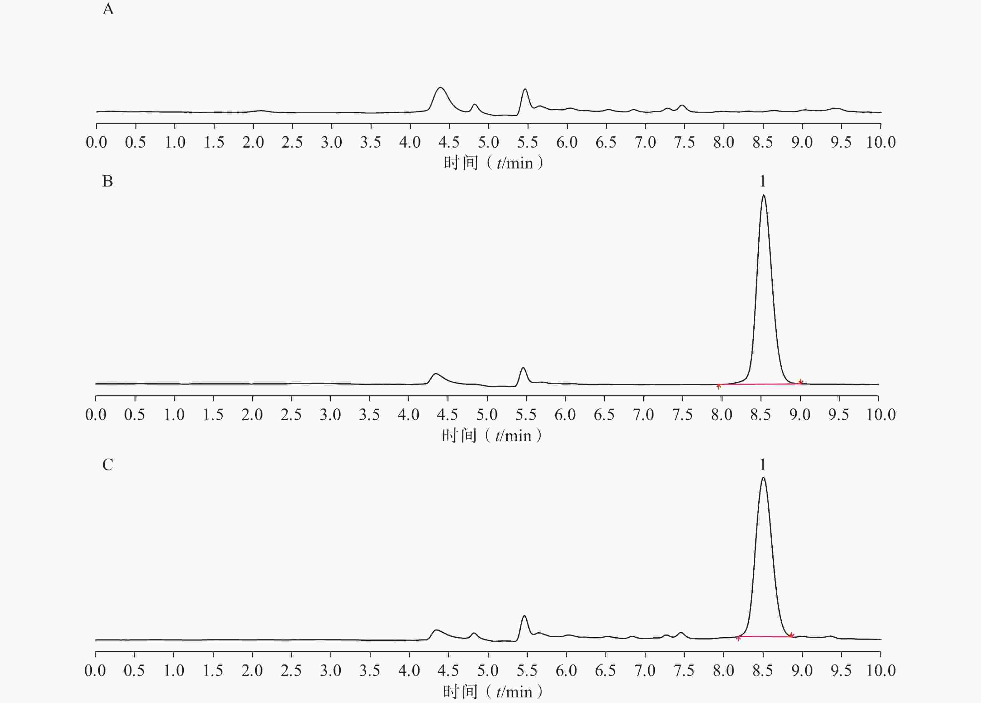 第一维色谱系统中,一维色谱柱:SNCB(T)-1A(硅胶,4.6 mm×50 mm, 5 µm),流动相A:VCV-1D移动相[甲醇-乙腈-磷酸铵水溶液(V/V/V=1∶3∶3,氨水调pH至7.0)],流速:0.4 ml/min;流动相B:水,流速:1.0 ml/min。第二维色谱系统中,二维色谱柱:Symmetry C18(4.6 mm×250 mm, 5 µm),流动相:乙腈:10 mmol/L乙酸铵溶液(25∶75),流速:1.0 ml/min;中间色谱柱:SBX4-MA(树脂,3.0 mm×10 mm,5 µm)。柱温:45 ℃,紫外检测波长:306 nm,进样量:200 μl。时间程序:0~2 min样品进样和第一维色谱分离;2~4 min目标物通过中间色谱柱转移至第二维色谱;4~10 min目标物在第二维色谱中分离分析。