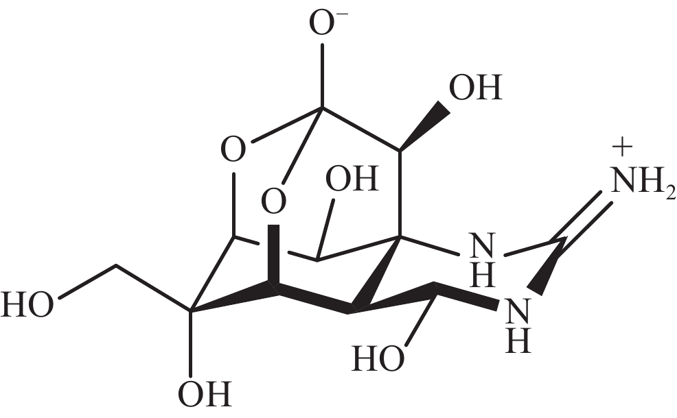 河豚毒素(TTX)是一种在自然环境中产生的致命神经毒素。其化学结构包含一个单独的胍基团,连接到一个高度氧化的碳主链上,TTX的碳主链由2,4-二噁金刚烷结构组成,并有5个羟基修饰,TTX是氨基全氢喹唑啉型化合物(图1)。TTX通过抑制神经和肌肉细胞的动作电位发挥作用,已成为研究可兴奋细胞的有用工具。一项使用乌贼巨大轴突的研究表明,TTX只阻断了钠通道而对静息膜电位没有影响[1],钠通道的结构被认为是一个钟形分子,含有多个腔,相对分子质量约为3×105[2]。自此以后,TTX成为神经生理学研究中的一种热门化学物质[3]。此外,TTX有望成为治疗偏头痛、海洛因成瘾者戒断和麻醉的药物,TTX在疼痛医学领域得到了较高的重视[4,5]。本文通过综述TTX的来源以及TTX的生物合成研究进展,重点关注TTX可能的微生物来源,为TTX的生产与生物合成研究提供科学参考。