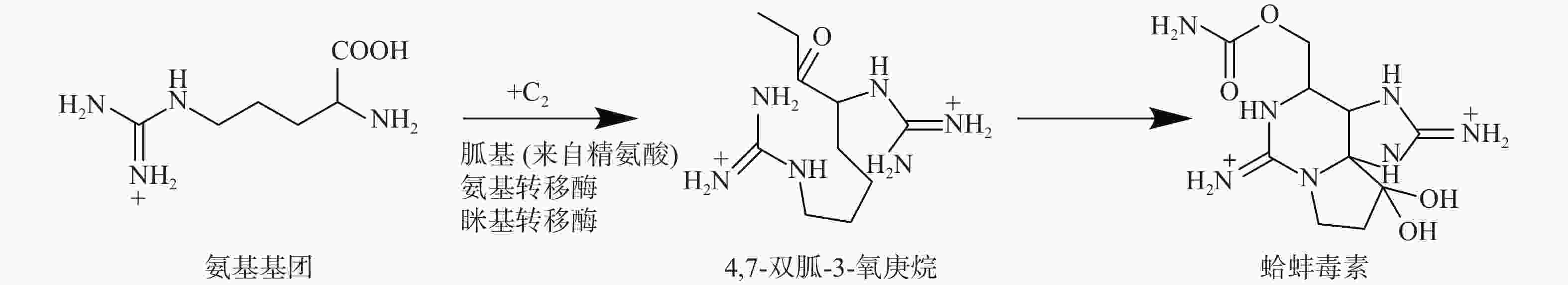 氨基转移酶是负责将胍基从供体转移到受体的酶,TTX中胍基部分的起源被认为是通过氨基转移酶从氨基供体(如精氨酸)到TTX生物合成的前体底物,这些酶也参与河豚毒素类似物的生物合成。例如蛤蚌毒素(saxitoxin)的生物合成研究中,首先氨基转移酶将氨基从精氨酸转移到蛤蚌毒素的前体4,7-双胍-3-氧庚烷,然后将前体4,7-双胍-3-氧庚烷引入到后续的生物合成中(图3)[34]。在该生物合成途径中,编码氨基转移酶的基因与包括NRPS和聚酮合成酶(PKS)的其他生物合成酶聚集在一起。蛤蚌毒素与TTX有许多相似之处,均是分子量相对较小的毒素[蛤蚌毒素(C10H17N7O4)分子量是299 g/mol,TTX(C11H17N3O8)分子量是319 g/mol]、化学结构有胍基、两者都是钠通道阻滞剂、且与钠通道的电压门控结合在同一位点。更重要的是,两者都已经被证明可以由微生物进行生物合成。因此,蛤蚌毒素和TTX的生物合成可能涉及类似的机制。在TTX生物合成中,氨基转移酶可以促进氨基与丙氨酸结合形成胍基丙酸酯,该底物可以被用作后续生物合成的前体,由后续PKS基因编码蛋白继续完成TTX的合成(图4)[35]。