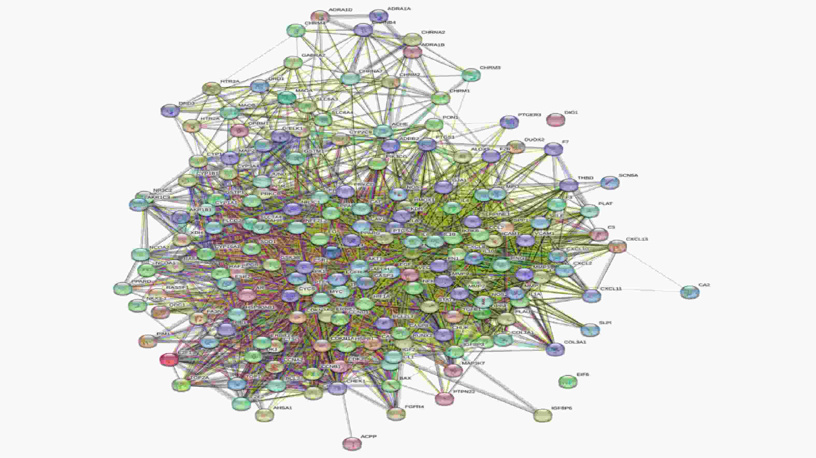 凭借STRING数据库进行PPI网络分析,共得到179个节点、3 602条边,平均节点度40.2(图2)。利用“Cytoscape”软件中“CytoNCA”功能得到其介数中心性、接近中心性、度值[16],通过筛选得到潜在核心靶点(表2)。