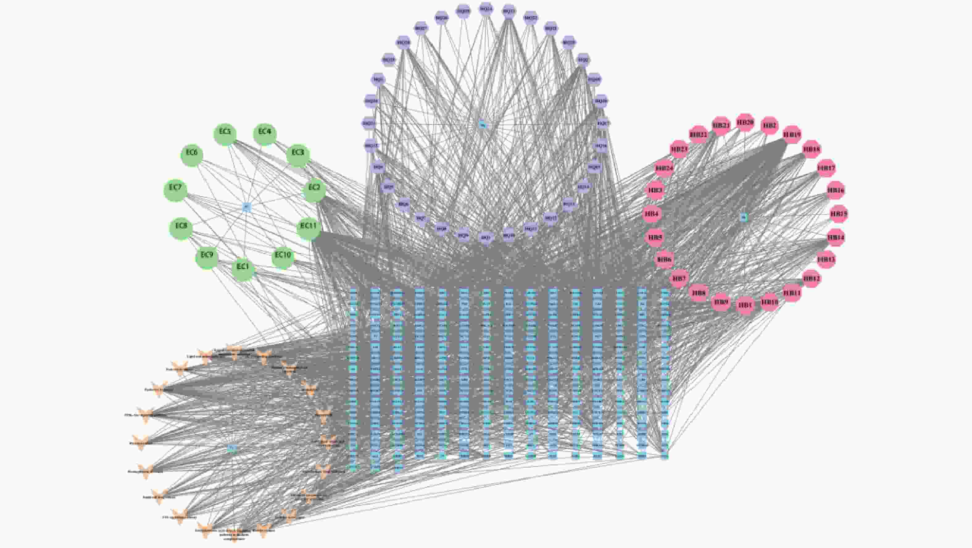 将“1.2”项中的潜在干预靶点和药物、疾病相关信息一起导入Cytoscape中,构建出制痂酊有效成分-靶点-疾病信息网络[10]。