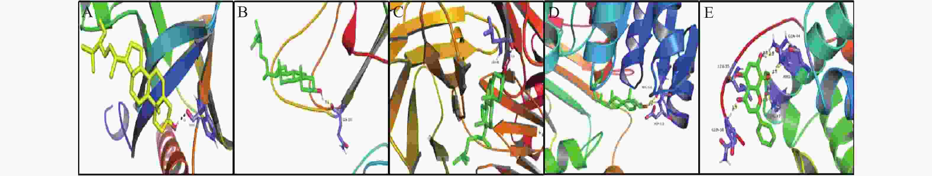 分别选取Cytoscape软件分析结果中度值前5位的有效成分与潜在作用靶点,先在TCMSP数据库和PCSD PDB数据库(https://www.rcsb.org/)搜索下载小分子化合物和蛋白质的3D结构,再通过AutoDock软件为小分子加氢、加ROOT,为蛋白剔除水分子、加氢等,然后选中所有活性位点,通过AutoDockTools设置对接盒子进行分子对接,最后利用Pymol软件渲染图片并输出结果[15]。