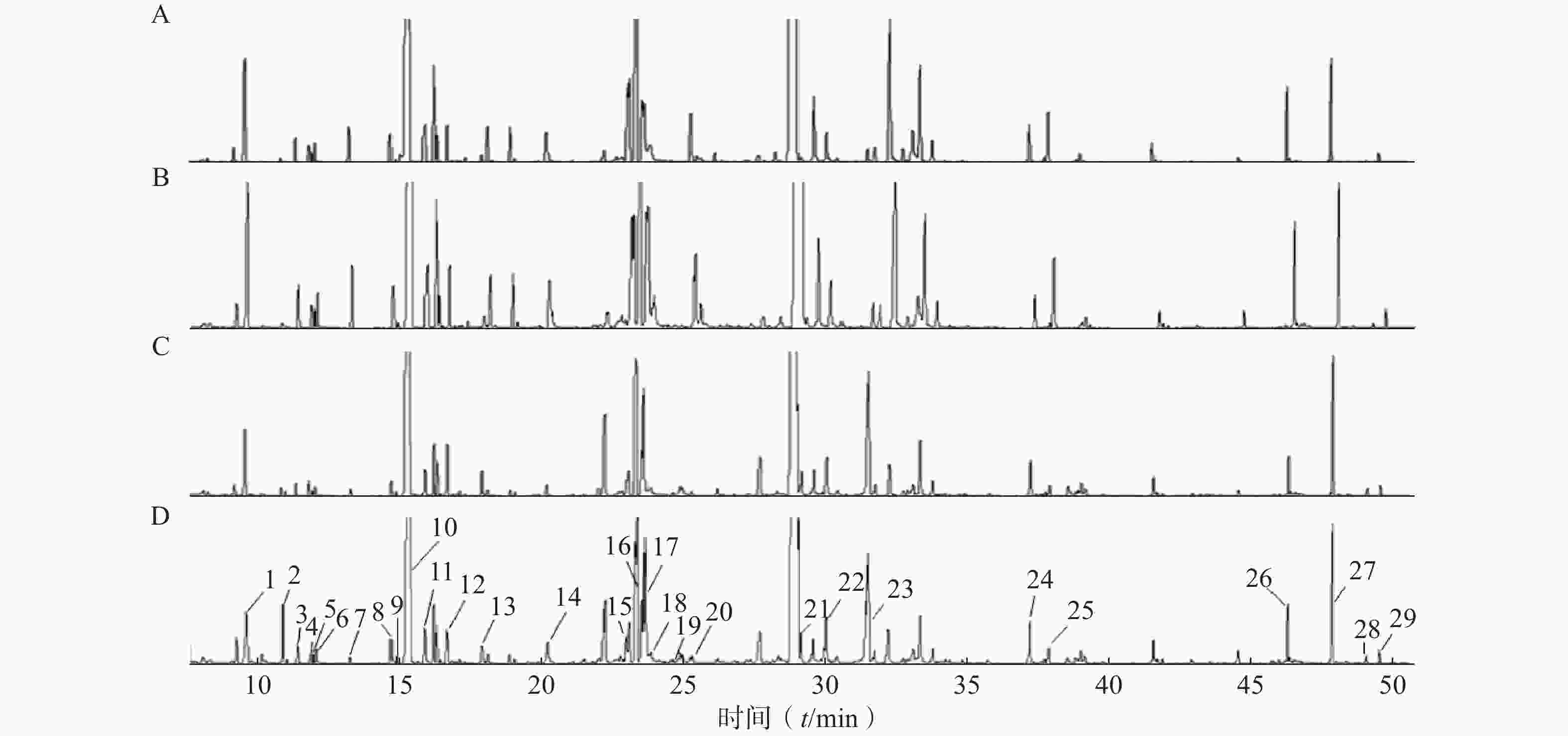 • 色谱条件:采用Agilent DB-5MS石英毛细管柱(30 m×0.25 mm,0.25 µm)进行代谢物分离;进样口温度:260 ℃;升温程序:起始温度为70 ℃,保持3 min,4 ℃/min升至220 ℃,再8 ℃/min升至310 ℃,保持10 min;载气:高纯氦气;流速:1.0 ml/min。进样量为1µl。质谱条件:电子轰击源(EI源),温度:200 ℃,扫描范围m/z50~800。