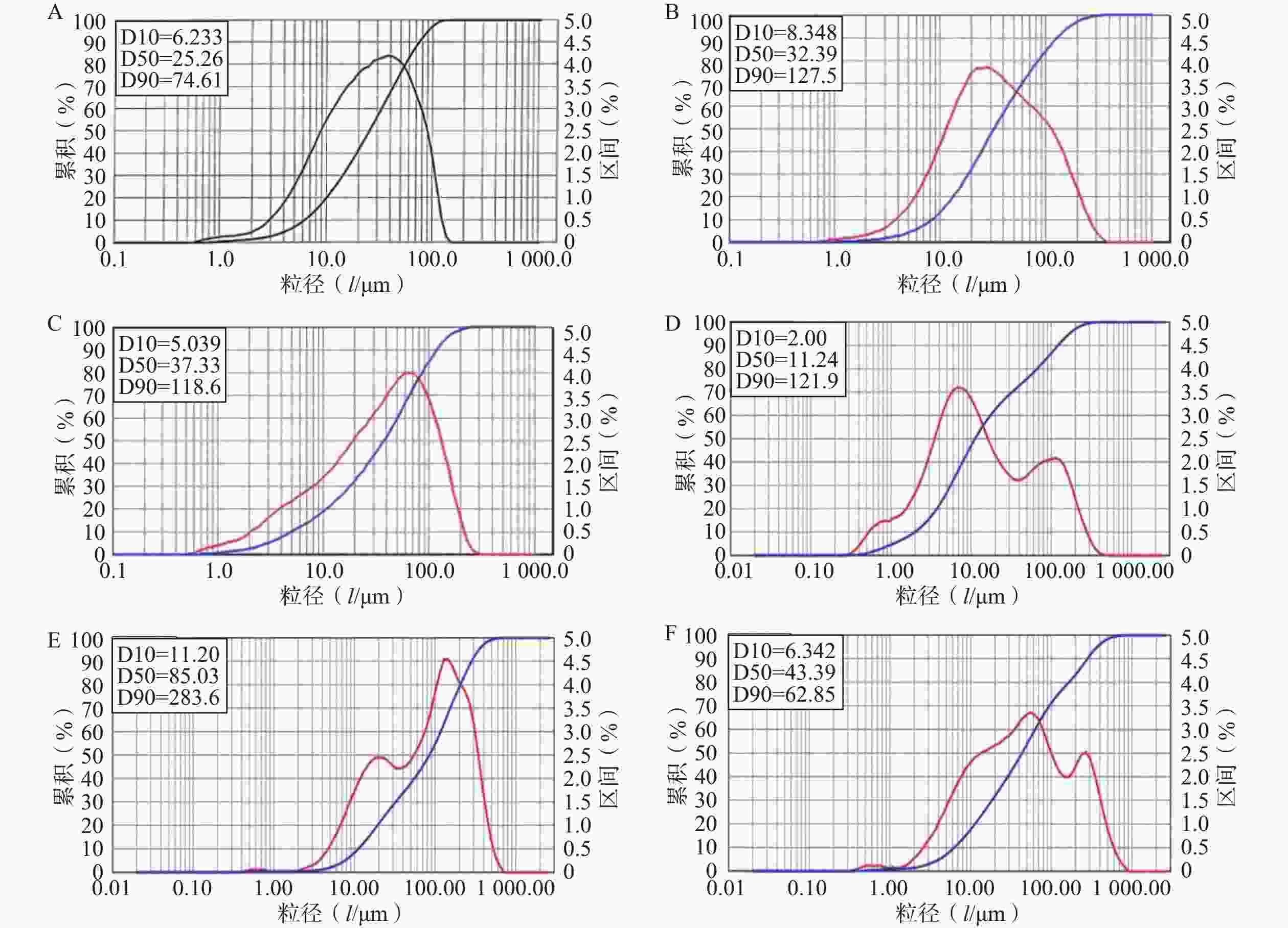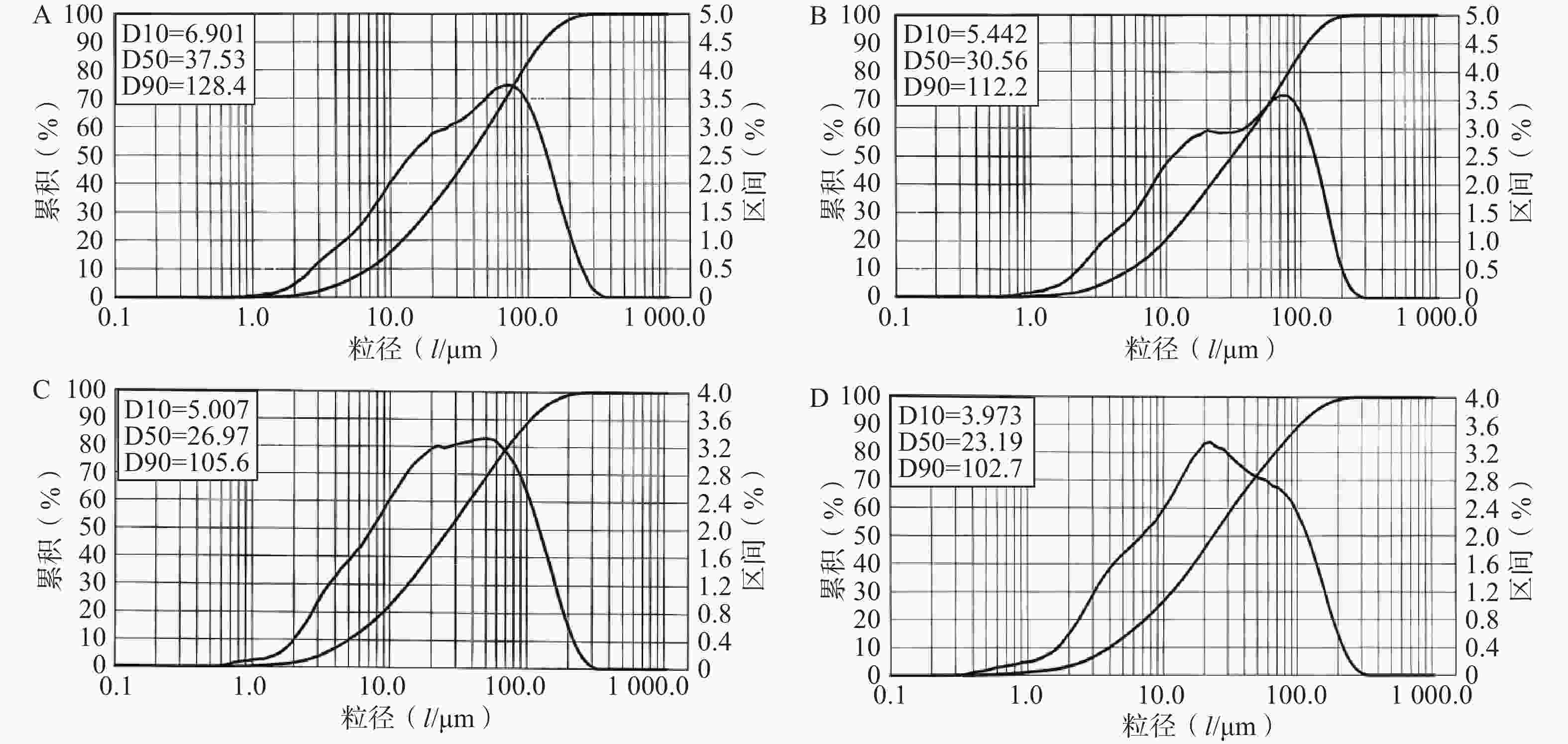 • 杨瑛等[8]对100种中药粉的激光粒度检测表明,77种微粉粒度分布在0.1~75 μm,23种分布在1~150 μm,揭示不同中药粉碎难度存在显著差异。