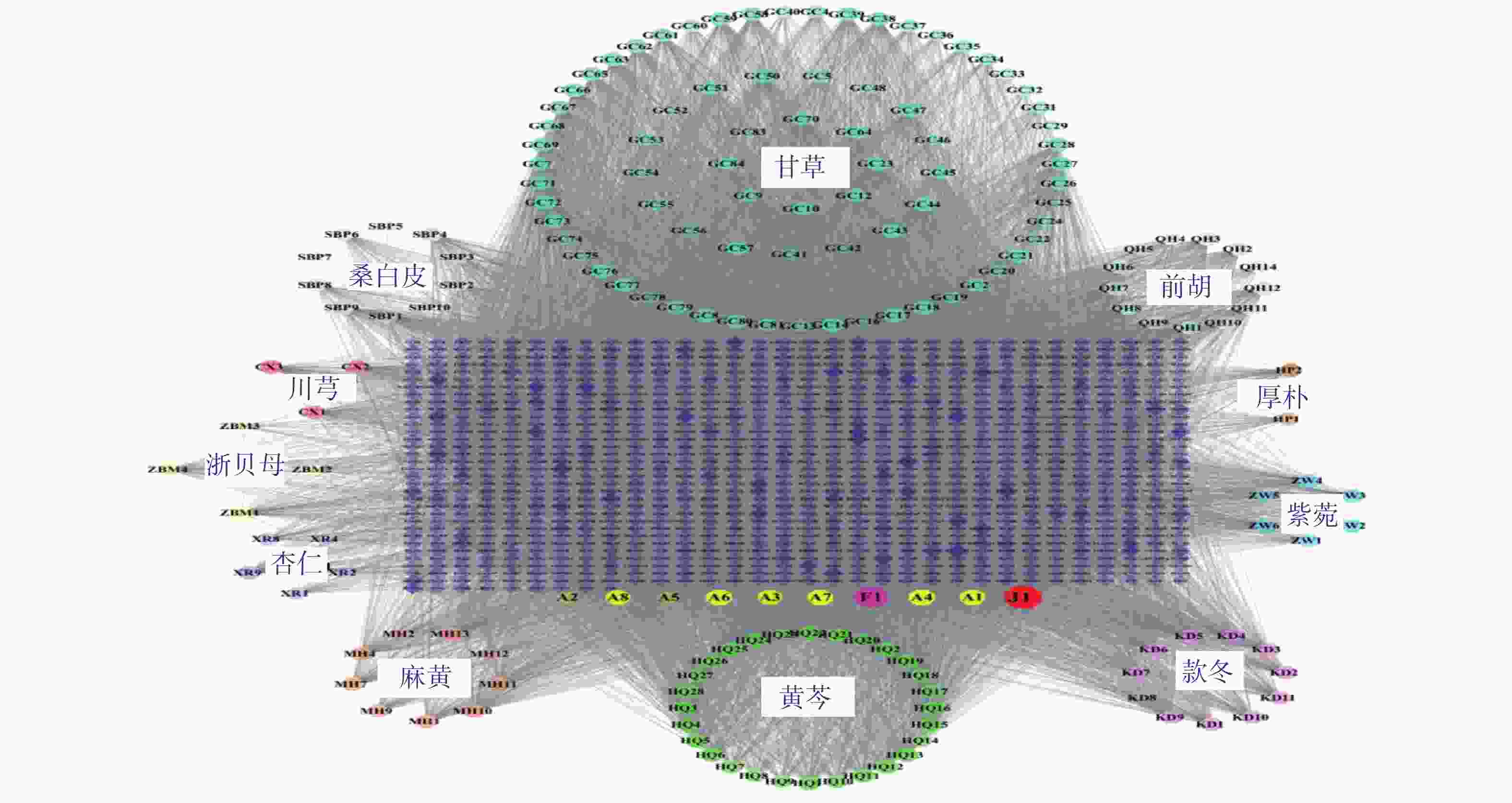 • 桑麻杏贝汤在TCMSP平台以OB≥30%,DL≥0.18,作为筛选条件,再结合TCMID数据库,桑白皮15个,杏仁10个,浙贝母4个,紫菀12个,川芎4个,甘草85个,厚朴2个,黄芩29个,款冬16个,麻黄16个,前胡18个,在SwissADME数据库中进行Pharmacokinetics与Druglikeness筛选后,共得到桑麻杏贝汤活性成分192个,通过SwissTargetPrediction数据库预测相应作用靶点,删去重复值共得到1 066个作用靶点。通过Cytoscape 3.8.2软件将活性成分-靶点进行可视化,得到“药物-活性成分-靶点”相互作用网络。该网络共有1 253个节点,15 304条边。度值越高,作用关系越密切,作用越明显。按度值排序,得出排名前5位的成份为:槲皮素(quercetin,J1),山柰酚(kaempferol,F1),光甘草定(glabridin,A4),异鼠李素(isorhamnetin,A6),木樨草素(luteolin,A7)。详见图1表1
