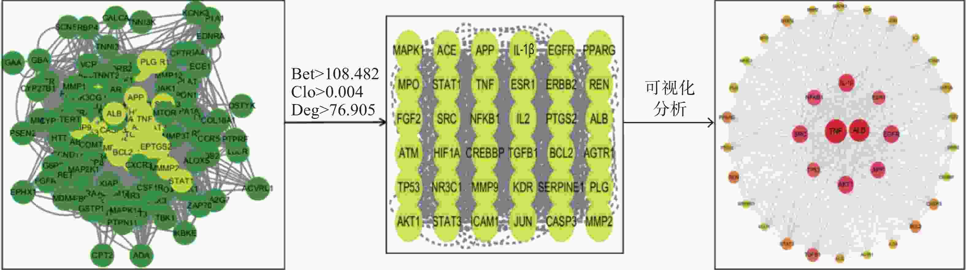注:TNF:肿瘤坏死因子;ALB:白蛋白;IL-1β:白细胞介素;AKT1:丝氨酸/苏氨酸蛋白激酶 1;SRC:酪氨酸专一性蛋白激酶;EGFR:表皮生长因子受体;APP:人类基因名;NFκB1:核因子活化B细胞κ轻链增强子1;ESR1:雌激素受体 1;TP53:抑癌基因。