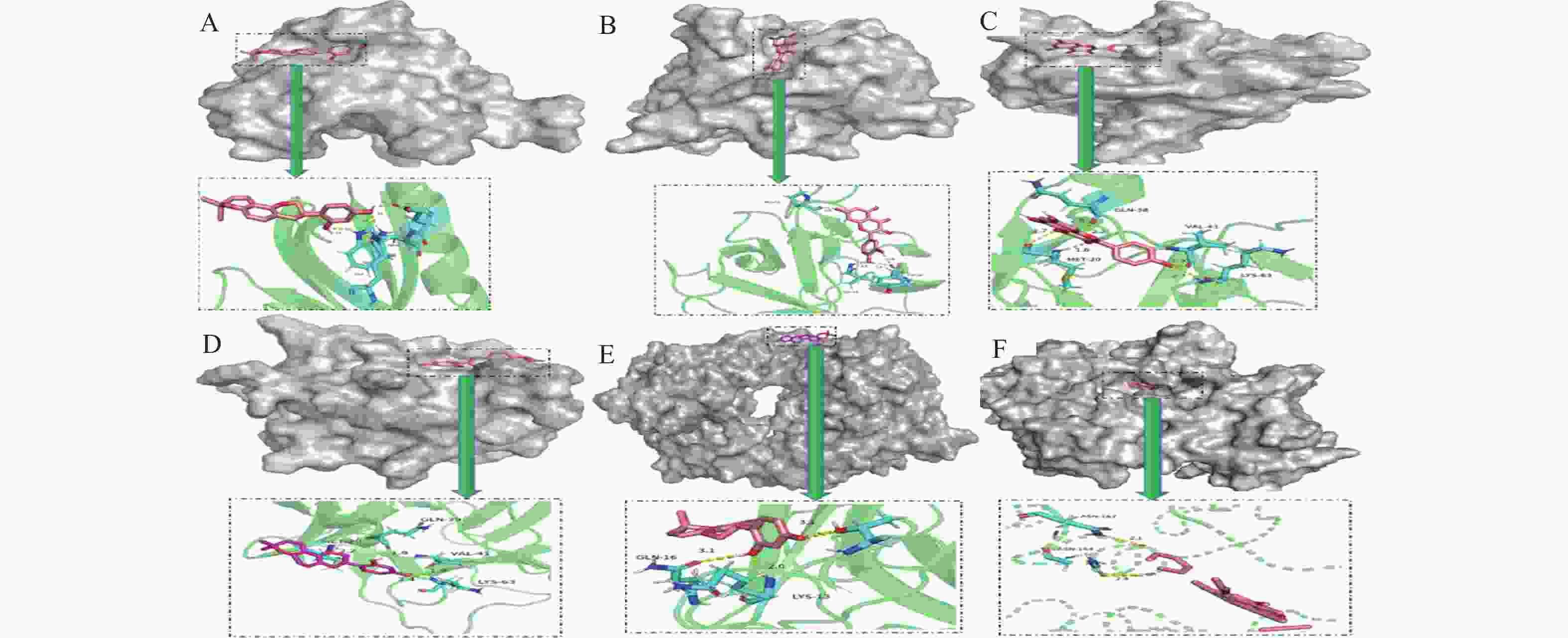 A. AKT1-光甘草定;B. IL-1β-槲皮素;C. IL-1β-山柰酚;D. IL-1β-光甘草定;E. EGFR-光甘草定;F. SRC-光甘草定