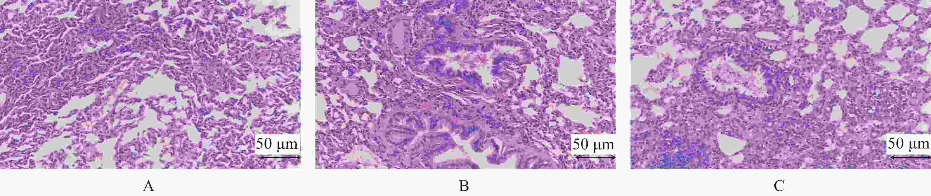 A. 对照组大鼠肺组织形态;B. 模型组大鼠肺组织形态;C. 治疗组大鼠肺组织形态