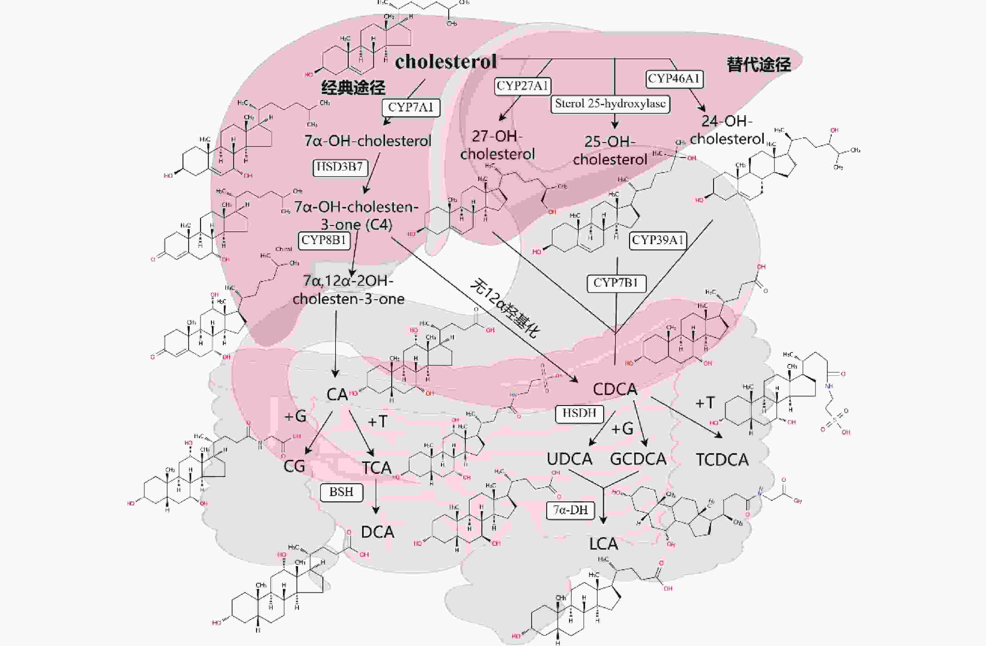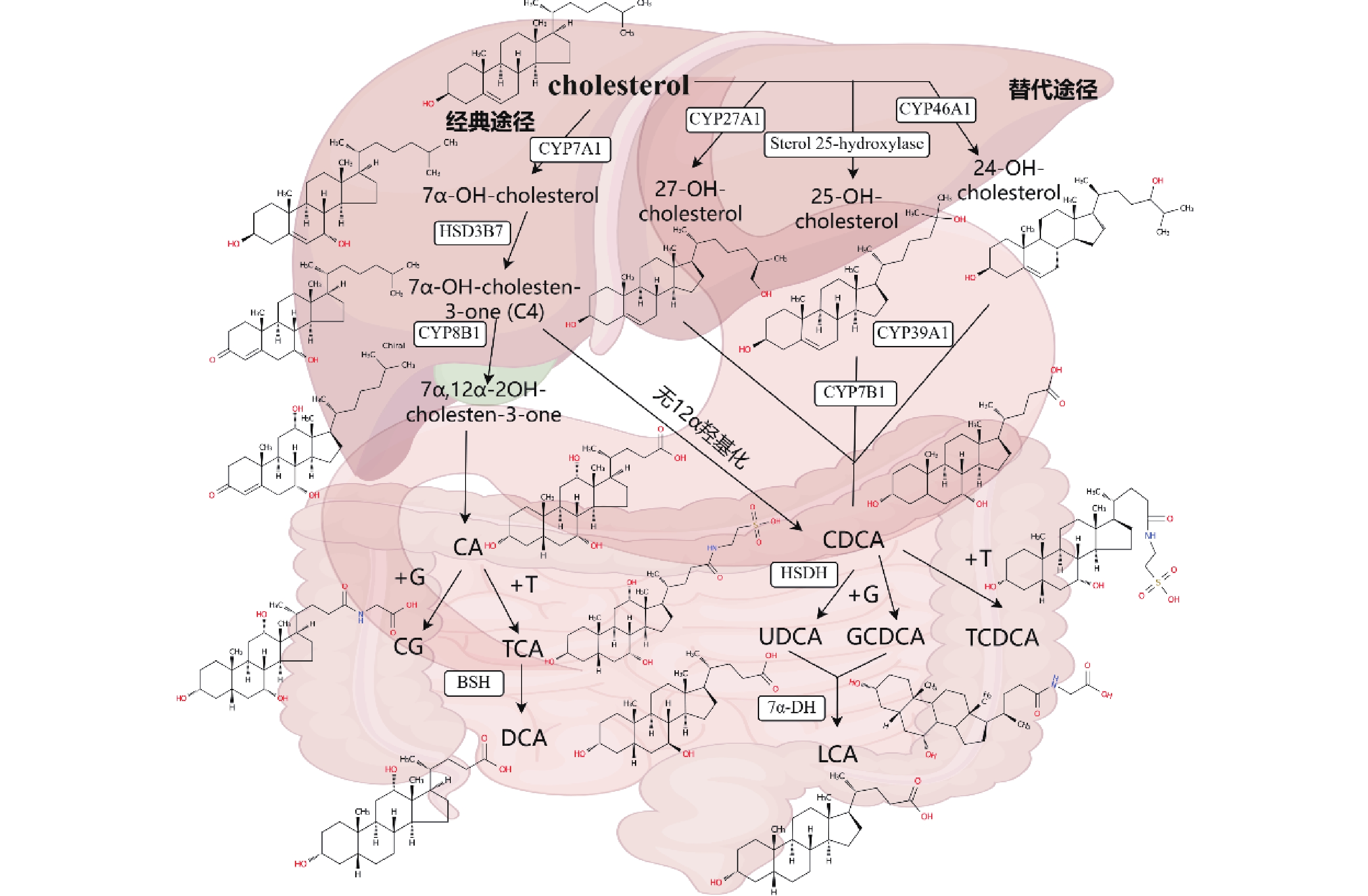 注:cholesterol:胆固醇;7α-OH-cholesterol:7α-羟基胆固醇;27-OH-cholesterol:27-羟基胆固醇;25-OH-cholesterol:25-羟胆固醇;24-OH-cholesterol:24-羟基胆固醇;7α-OH-cholesten-3-one(C4):7α-羟基胆甾烯酮;7α,12α-2OH-cholesten-3-one:7α,12α-二羟基胆甾烯酮;CA:胆酸;DCA:脱氧胆酸;G:甘氨酸;T:牛磺酸;CG:甘氨胆酸;TCA:牛磺胆酸;CDCA:鹅去氧胆酸;UDCA:熊去氧胆酸;GCDCA:甘氨鹅去氧胆酸;TCDCA:牛磺鹅脱氧胆酸;LCA:石胆酸;CYP7A1:胆固醇7α-羟化酶;CYP27A1:胆固醇27-羟化酶;Sterol 25-hydroxylase:甾醇25-羟化酶;CYP46A1:CYP450重组酶;HSD3B7:3β-羟基类固醇脱氢酶7;CYP8B1:甾醇-12α-羟化酶;CYP39A1:胆固醇24α7羟化酶;CYP7B1:氧化胆固醇7α-羟化酶;HSDH:3β-羟基类固醇脱氢酶;BSH:胆盐水解酶;7α-DH:7α脱羟酶。