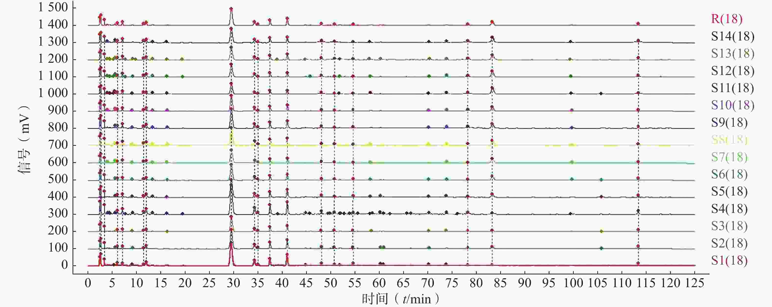 • 取14批姜桂颗粒(编号依次为 S1~S14)样品,按“2.2.1”项下方法制备供试品溶液,再按“2.1”项下色谱条件进样测定。将得到的所有图谱导入《中药色谱指纹图谱相似度评价系统(2012版)》,以各成分色谱响应均较强的S1样品为参照,采用中位数法,时间窗宽度为0.3 min,选择多点校正的方法,并选择Mark峰匹配[12-14],生成姜桂颗粒的HPLC叠加指纹图谱和对照图谱(R)。结果显示,姜桂颗粒的14批样品中,有18个共有峰。结果见图1