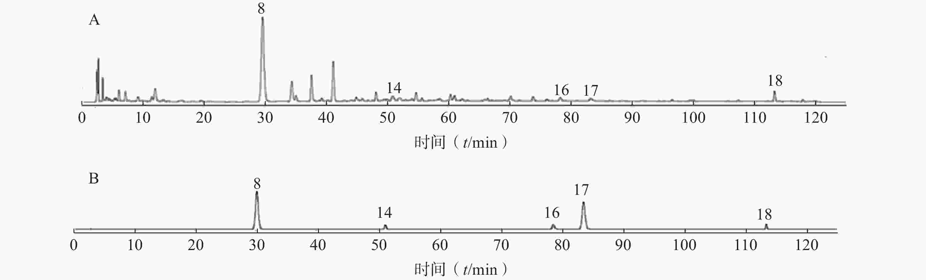 • 分别取“2.2.2”项下混合对照品溶液和“2.2.1”项下供试品溶液,按“2.1”项下色谱条件进样测定,记录HPLC图(图2)。通过供试品溶液与混合对照品溶液的比对,共指认出了 5个共有峰,分别为葛根素(8号峰)、甘草苷(14号峰)、肉桂酸(16号峰)、桂皮醛(17号峰)、甘草酸铵(18号峰)。