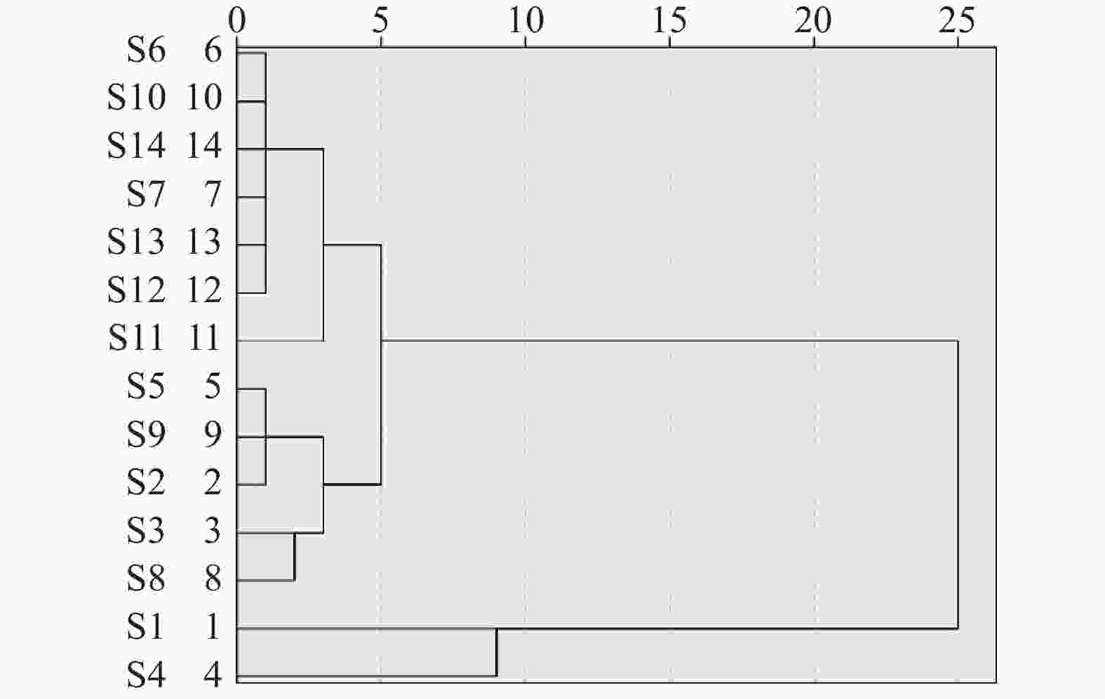 • 以18个共有峰的峰面积为变量,以平方欧氏距离为度量标准,采用SPSS 25.0软件进行聚类分析[18-19]。结果显示,当类间距离为10时,14批样品可聚为两类,其中,S1和S4为一类,剩下的样品为一类,表明这14批次样品的成分含量存在一定的差异,这可能与药材来源、采收和生产加工工艺有关,结果见图3