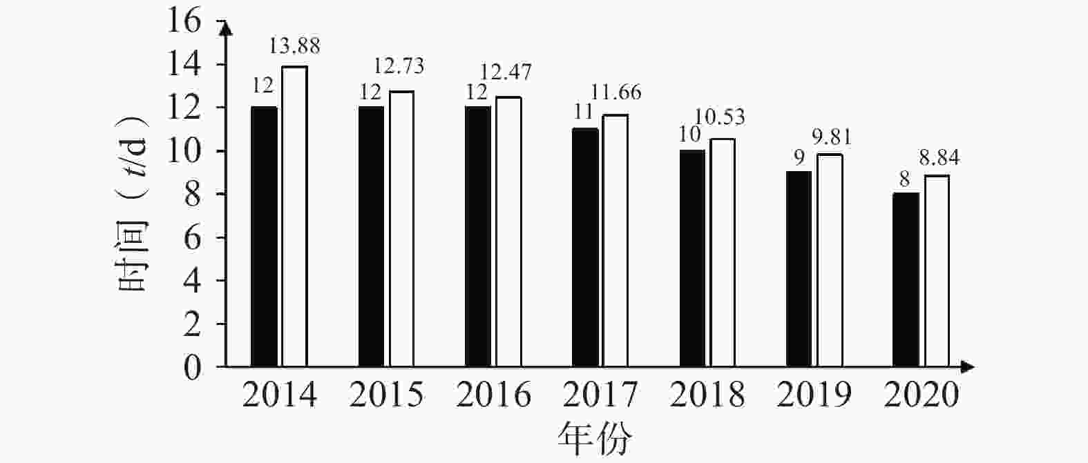 2014−2020年,北京大学人民医院肺癌患者平均住院时间持续缩短,由2014年13.88 d缩短至2020年的8.84 d;中位住院天数也逐渐缩短,在2014−2016年这3年间均为12 d,自2017年起逐年缩短1 d(图1)。
