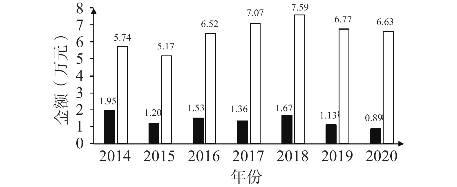 年份 0~20岁 21~40岁 41~60岁 61~80岁 >80岁 合计 男 女 男 女 男 女 男 女 男 女 2014 0 0 12 14 209 155 272 185 27 14 888 2015 0 1 12 15 165 173 296 184 27 13 886 2016 0 0 10 21 196 182 337 224 31 11 1012 2017 0 0 10 24 204 229 300 255 27 22 1071 2018 0 0 16 12 224 242 345 304 37 26 1206 2019 0 1 14 25 207 229 376 223 40 23 1138 2020 0 1 16 28 163 239 255 201 22 13 938 合计 0 3 90 139 1368 1449 2181 1576 211 122 7139 3 229 2817 3757 333 表 3 2014−2020年肺癌治疗药品ATC亚类DDDs与人均DDDs变化情况