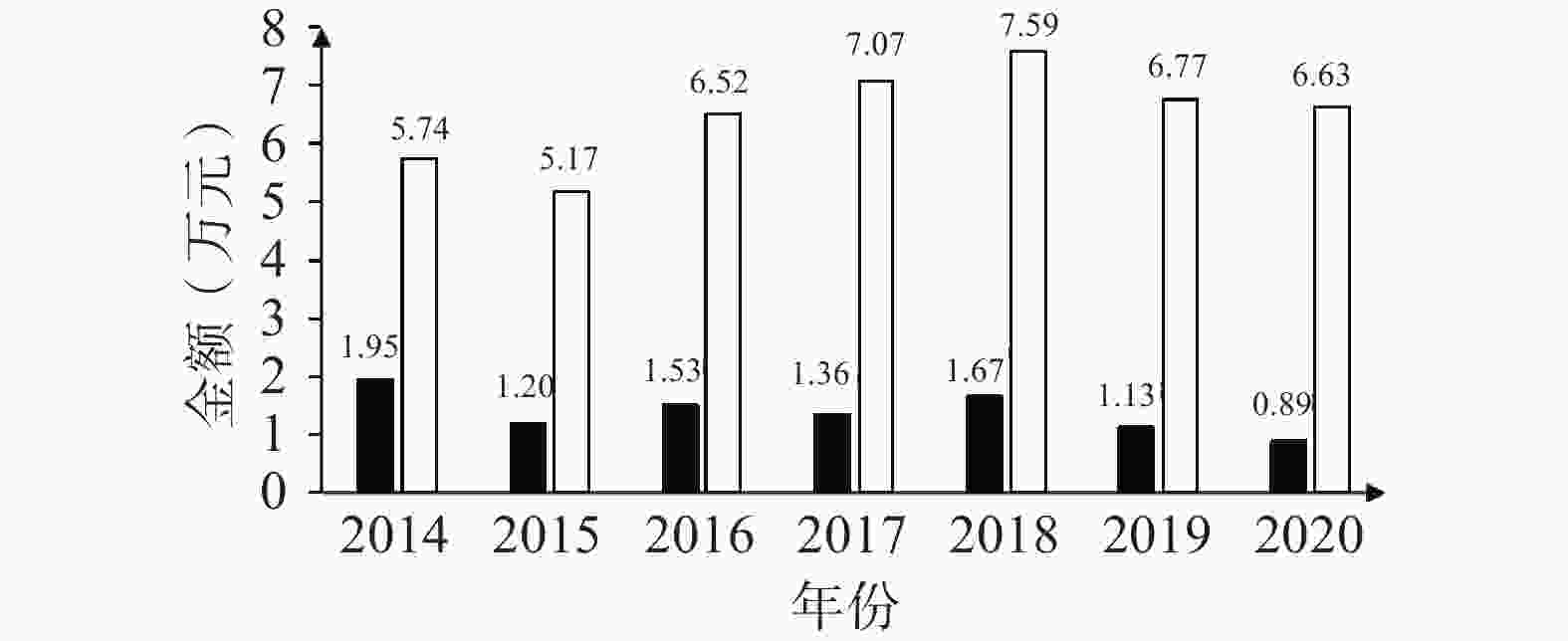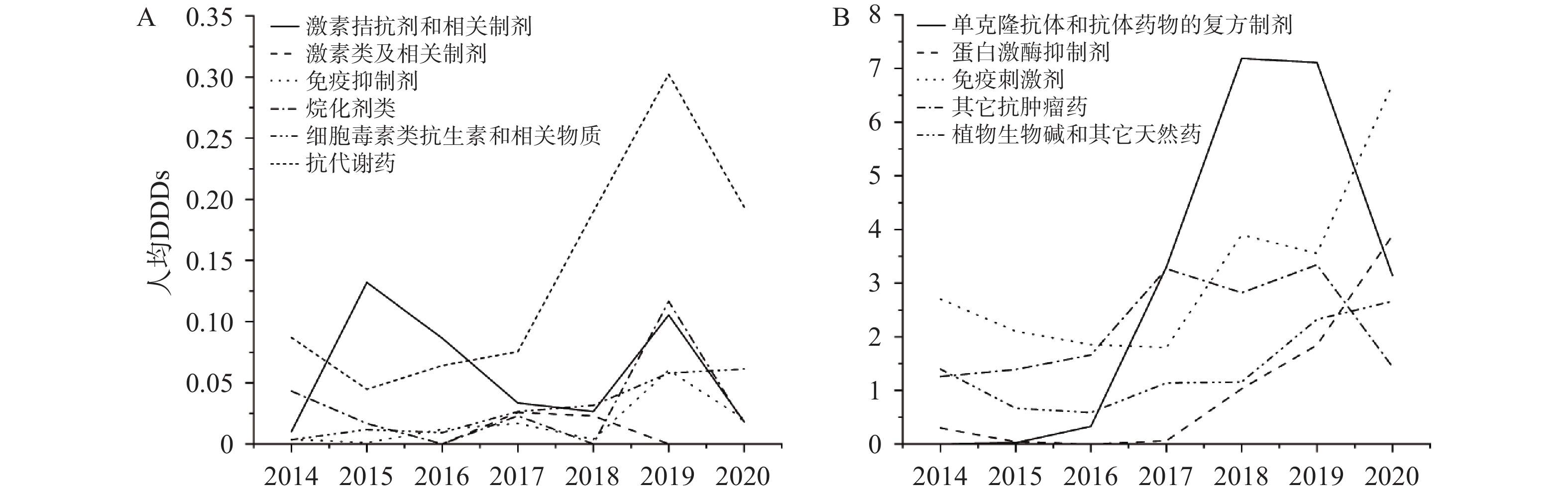 年份 抗肿瘤药 免疫刺激剂 免疫抑制剂 内分泌治疗用药 DDDs 人均DDDs DDDs 人均DDDs DDDs 人均DDDs DDDs 人均DDDs 2014 2 739.44 3.08 2 399.31 2.70 3.38 0.00 9.00 0.01 2015 1 942.26 2.19 1 865.64 2.11 1.00 0.00 117.00 0.13 2016 2 677.98 2.65 1 879.15 1.86 12.13 0.01 87.50 0.09 2017 8 449.34 7.89 1 929.85 1.80 18.00 0.02 63.69 0.06 2018 14 972.89 12.42 4 704.34 3.90 4.50 0.00 59.69 0.05 2019 17 189.21 15.10 4 043.38 3.55 68.75 0.06 120.00 0.11 2020 10 698.68 11.41 6 285.43 6.70 19.04 0.02 17.00 0.02 表 4 2014−2020年肺癌治疗药品ATC小类人均DDDs变化情况