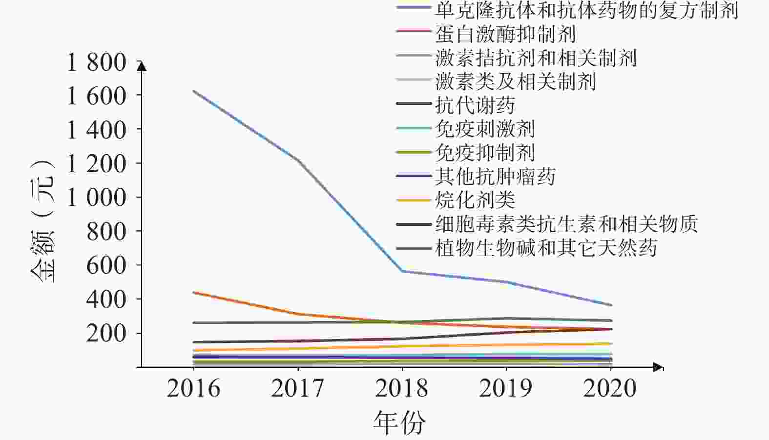 ATC小类 2015年 2016年 2017年 2018年 2019年 2020年 其他烷化剂 3 561.46 3 455.19 3 357.03 3 210.63 3 032.82 3 003.15 CD20(分化20族)抑制剂 3 143.88 3 172.50 2 658.22 2 005.72 1 838.17 1 561.68 单克隆抗体 0.00 0.00 0.00 0.00 1414.54 1414.71 拓扑异构酶Ⅰ抑制剂 821.12 789.61 739.18 690.41 656.12 635.88 ALK抑制剂 1 775.44 1 779.90 1 778.89 813.53 535.39 505.11 集落刺激因子 268.84 290.89 342.40 414.59 508.25 413.81 VEGF/VEGFR抑制剂 1 299.12 1 299.18 849.79 494.58 482.62 350.20 其他蛋白激酶抑制剂 686.59 712.67 585.29 440.71 359.76 342.56 紫杉烷类 292.07 296.77 300.79 299.74 322.47 299.06 PD-1/PD-L1抑制剂 0.00 0.00 0.00 0.00 734.68 269.74 HER2抑制剂 1 010.96 1 006.24 663.87 338.83 332.59 246.08 蒽环类及相关物质 142.20 146.55 152.05 166.94 203.51 223.28 EGFR酪氨酸激酶抑制剂 475.93 383.55 237.83 210.19 201.39 193.15 TNF - α抑制剂 214.20 207.35 199.97 192.57 185.41 160.22 嘧啶类似药 217.70 212.51 207.33 195.45 181.74 139.83 BCR-ABL酪氨酸激酶抑制剂 580.19 443.08 365.38 310.87 194.66 138.48 白介素类 65.87 68.83 70.45 68.53 70.14 72.72 其他抗肿瘤药 56.17 80.33 85.00 78.07 83.62 56.81 促性腺激素释放激素的类似药 69.41 67.09 63.60 60.41 57.23 55.64 铂化合物类 51.48 53.80 51.02 48.21 46.91 45.57 长春花碱及类似药 61.30 60.09 53.48 51.98 47.10 44.45 鬼臼毒素衍生物 23.37 23.89 21.96 21.63 26.56 38.28 其他免疫抑制剂 12.89 12.79 14.98 18.13 25.49 30.84 选择性免疫抑制剂 30.66 27.74 27.70 28.21 27.84 29.77 其他免疫刺激剂 60.73 60.75 55.96 49.74 44.51 29.14 亚硝基脲类 1.32 1.32 1.37 4.52 18.61 20.91 芳香化酶抑制剂 26.17 25.79 24.92 24.10 22.78 20.82 叶酸类似药 20.12 21.29 21.26 22.02 20.93 18.44 氮芥类似药类 5.93 8.27 7.91 14.39 14.48 14.49 其他植物生物碱和其它天然药 12.12 11.64 9.40 8.37 7.92 7.39 抗雌激素类 0.76 0.96 1.03 1.08 1.54 2.60 注:VEGF/VEGFR:血管内皮生长因子/血管内皮生长因子受体;EGFR:表皮生长因子受体;ALK:间变性淋巴瘤激酶;PD-1/PD-L1程序性死亡受体1/细胞程序性死亡配体1;HER2:人表皮生长因子受体2;TNF-α:肿瘤坏死因子α。 -