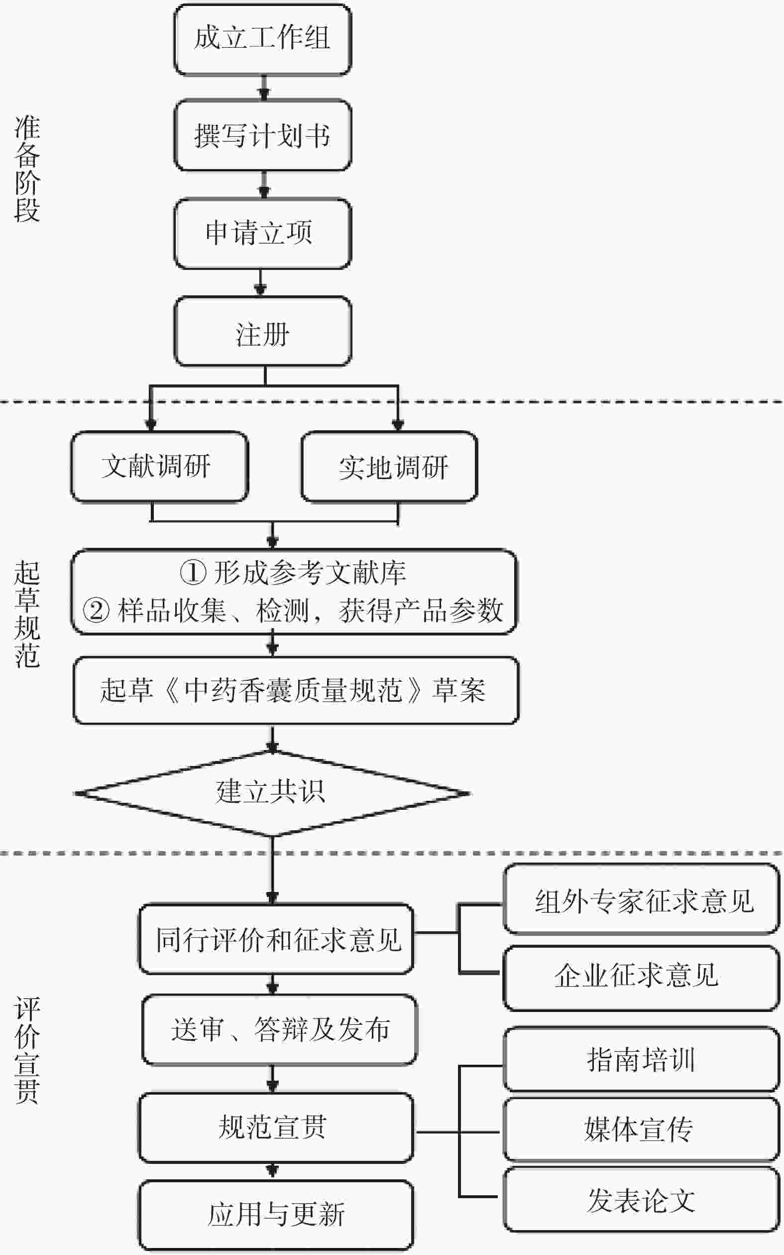中药香囊标准的制定包括制定计划-调查研究、收集资料-起草标准草案-征求意见-审查审定-标准验证-批准-编号发布等8个步骤,见图1。