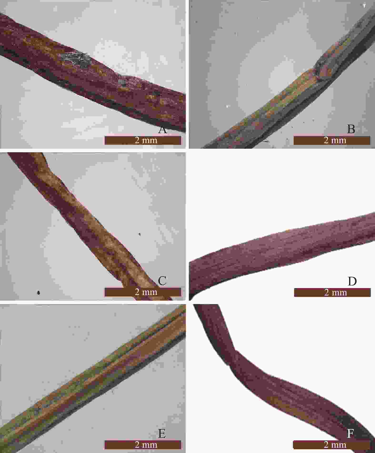 分别选取叶片的叶端、中部、基部,使用单面刀片将对各部位进行徒手切片。再将叶片置于试管中,加水合氯醛没过叶片后置于酒精灯加热。加热4~5分钟,期间需注意补充适量的水合氯醛,避免蒸干,结束后取出并擦干溶液,用砂纸磨去叶片的上表面和叶肉组织,得到叶片的下表面组织。再用相同方法制得叶片的上表面组织。将所得的样品组织依次置于载玻片,加适量水合氯醛,装片后放置于薄层加热板上,105℃加热,透化2分钟左右,置于偏光显微镜下观察并拍摄,最后选取适宜照片。