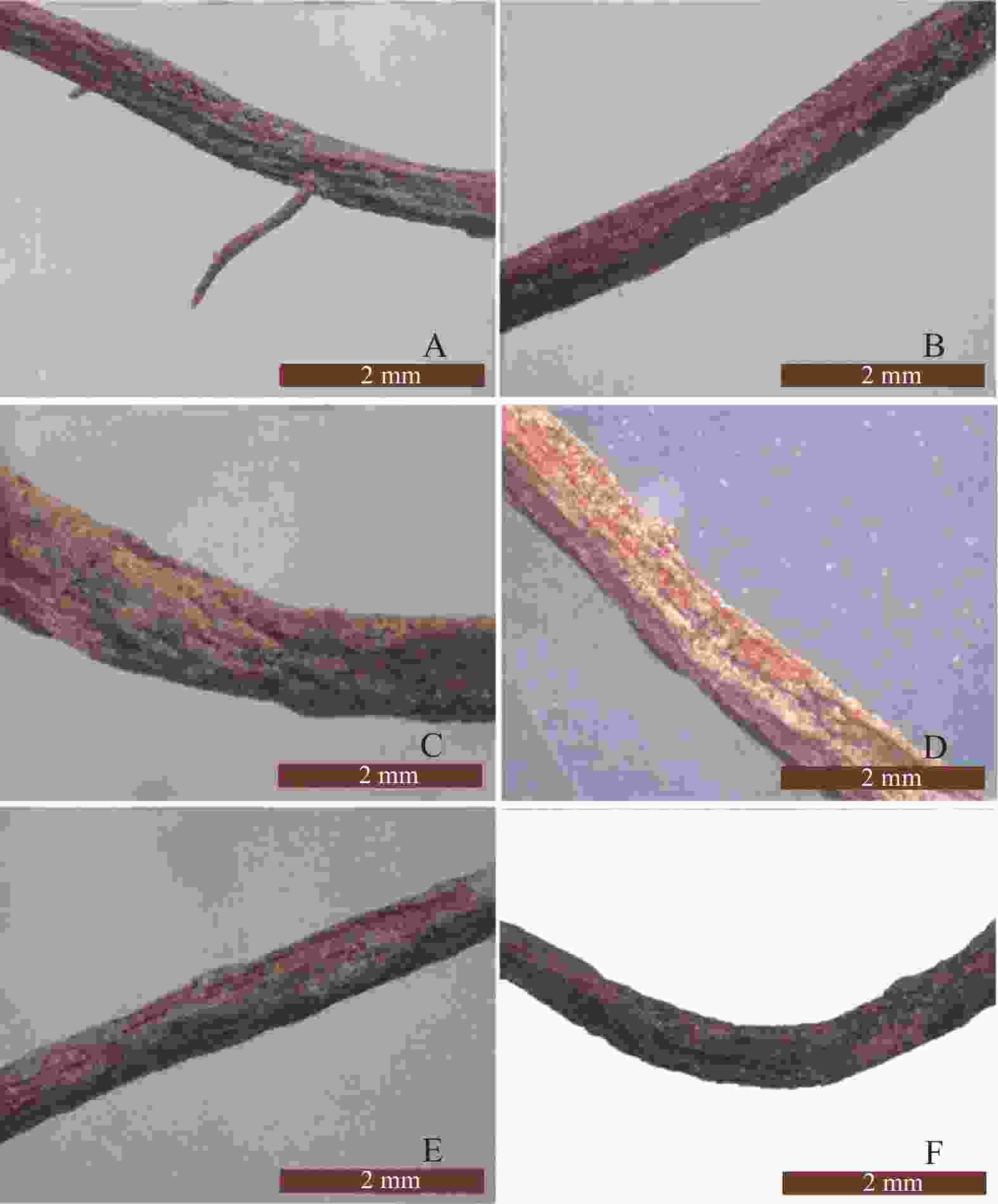 不同批次车前草的须根表面均有纵棱,可见绒根,区别在于须根表面有无褶皱以及须根的表皮是否呈片状脱落,如Y11-Y15、Y16-Y20、Y26-Y30样品须根表面有褶皱,其余样品较为平坦,Y6-Y10、Y11-Y15样品表皮呈片状脱落,具体微性状特征如图5所示。