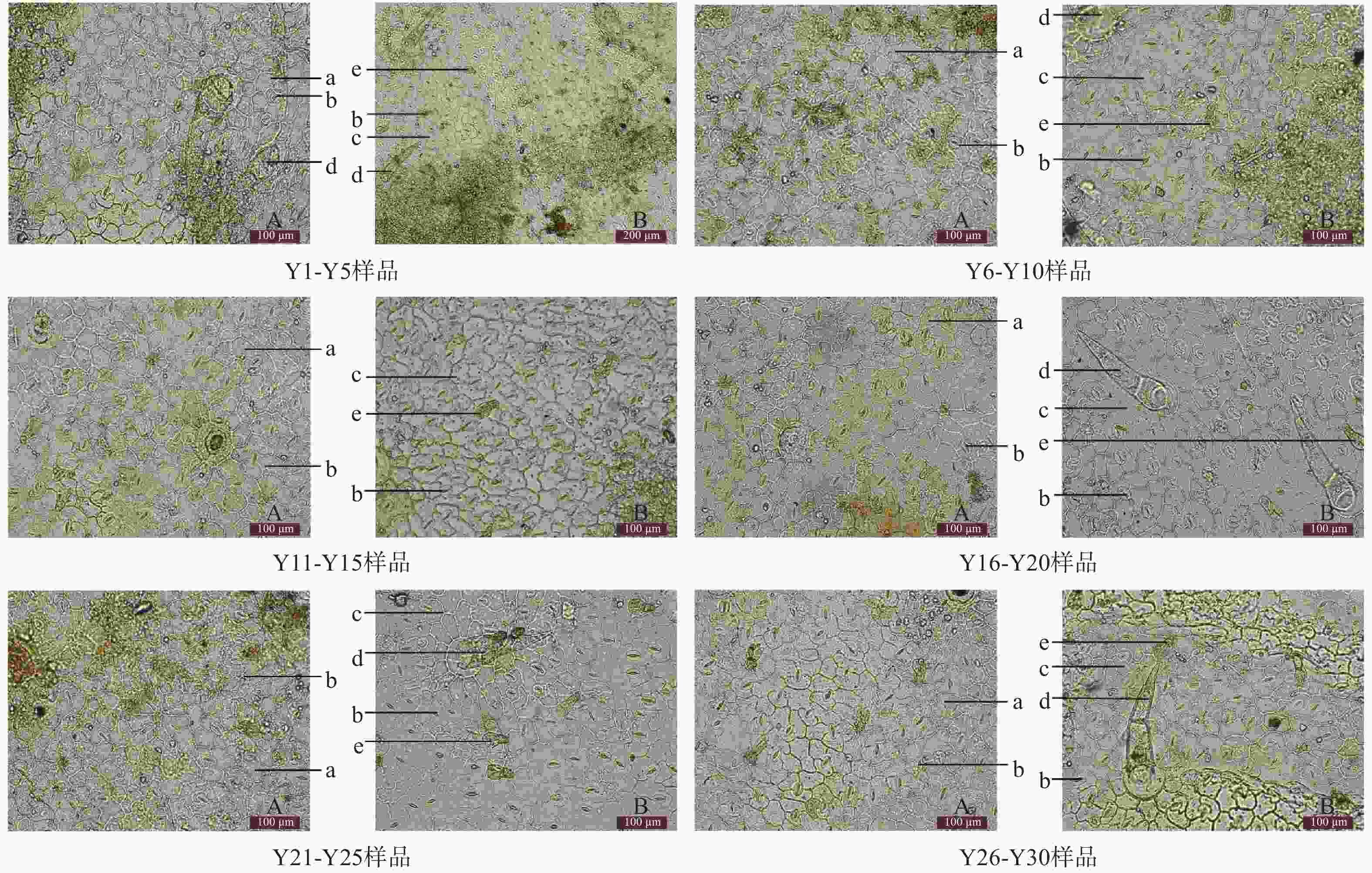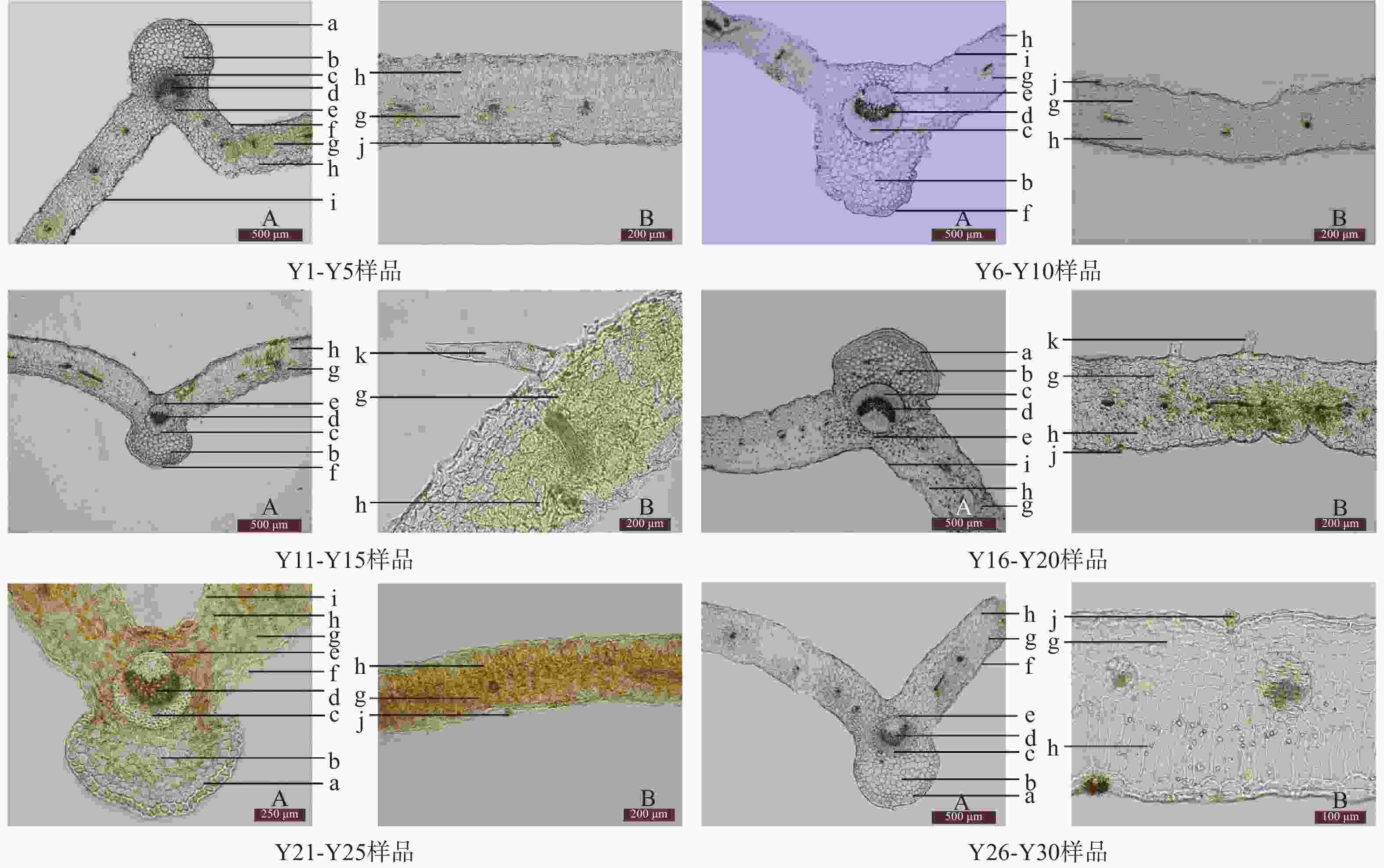 批次 叶表面 叶主脉横切面 叶柄横切面 叶肉 上表皮垂周壁 非腺毛 维管束 上表皮 大型维管束 下表面 内皮层 栅栏组织数量 栅栏层细胞形态 Y1-Y5 平直 存在 弯月形 内凹 7个,弯月形或半圆形 波浪状 长方形 1~2层 长方形或椭圆形 Y6-Y10 弯曲 存在 弯月形 外凹 7个,半圆形 波浪状 椭圆形 3~4层 长方形或椭圆形 Y11-Y15 平直 未见 半圆形 内凹 5个,弯月形或半圆形 半圆状 椭圆形 1~2层 长方形或椭圆形 Y16-Y20 平直 存在 弯月形 内凹 5个,弯月形或半圆形 波浪状 长方形 4~5层 类圆形或椭圆形 Y20-Y25 弯曲 存在 弯月形 内凹 7个,弯月形或半圆形 波浪状 椭圆形 1~2层 长方形或椭圆形 Y25-Y30 弯曲 存在 弯月形 内凹 5个,弯月形或半圆形 波浪状 椭圆形 1~2层 长方形或椭圆形 -