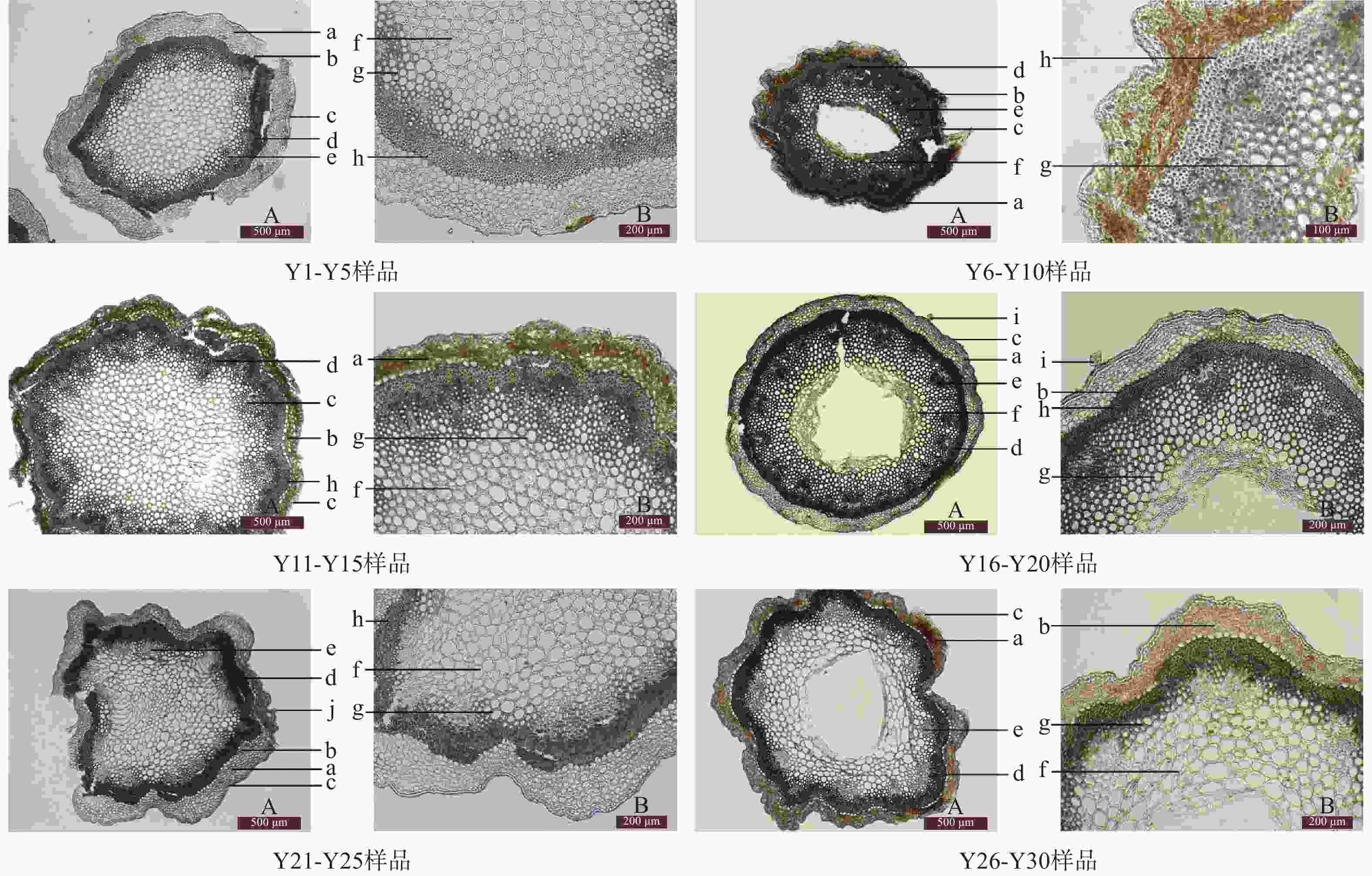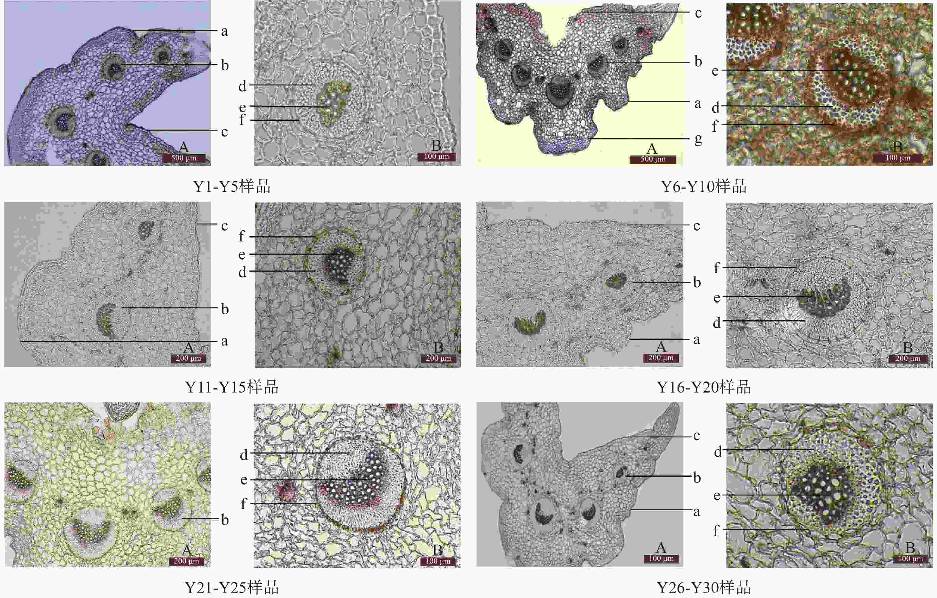 批次 表皮细胞 腺毛 非腺毛 内皮层 中柱鞘纤维 维管束 Y1-Y5 1列,类圆形 存在 存在 类圆形 5~7列 16~19个 Y6-Y10 1列,类圆形 存在 存在 类圆形 5~7列 18~22个 Y11-Y15 1列,类圆形 存在 存在 类圆形 5~7列 16~19个 Y16-Y20 1列,类圆形 存在 存在 类圆形 5~7列 16~19个 Y21-Y25 1列,类圆形 存在 极少见 类椭圆形 5~7列 16~19个 Y25-Y30 1列,类圆形 存在 极少见 类圆形 5~7列 16~17个 -