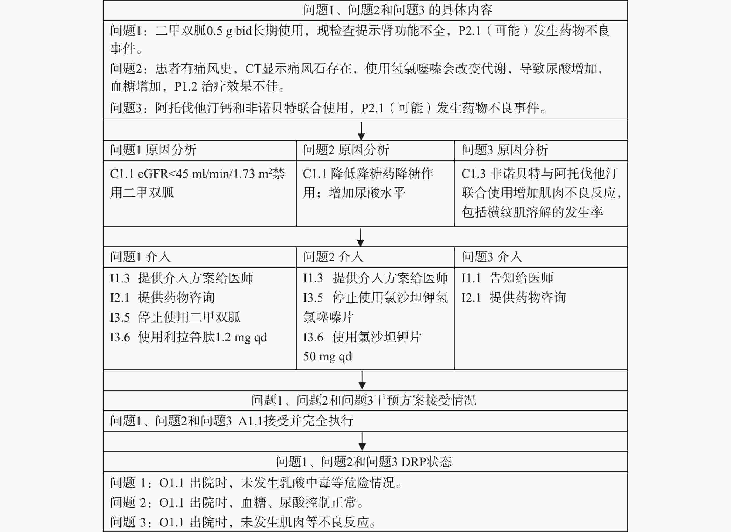• 经过临床药师评估,患者药物治疗方案存在3个问题,使用PCNE工具进行DRPs分类,如图1。问题1:二甲双胍0.5 g bid长期使用,现检查提示肾功能不全,eGFR<45 ml/min/1.73 m2,根据二甲双胍说明书和临床指南,二甲双胍从肾脏排出,如肾功能异常,可能导致体内堆积,影响乳酸代谢,产生乳酸中毒等严重不良反应[9],此患者慢性肾功能不全,属于CKD3b期,应禁止使用二甲双胍。问题2:患者有痛风史,同时CT显示痛风石存在,联合用药的过程中,应该考虑不影响尿酸代谢的药品,而氢氯噻嗪通过竞争作用,降低肾脏排泄尿酸的能力,导致尿酸增加,因患者有糖尿病,氢氯噻嗪可以影响胰岛素释放,使血糖增加,导致血糖和尿酸治疗效果不佳。问题3:阿托伐他汀钙和非诺贝特联合使用:低密度脂蛋白胆固醇是临床高脂血症患者首要干预靶点,但在TG>5.6 mmol/L时,考虑胰腺炎发生风险增加,优先干预TG,该患者TG 8.10 mmol/L,需要优先干预TG,使用阿托伐他汀联合非诺贝特,但两药联合使用存在诸多风险,如患者DKD是他汀类药物引起肌病的高危人群,贝特类药物也能增加肌酐水平,增加肌病发生的风险,因此需要充分评估患者的风险与收益,在保证治疗效果的基础上,减少两药的联合使用,若必须联合使用,需要充分告知其风险,增加用药宣教,了解药物治疗风险。