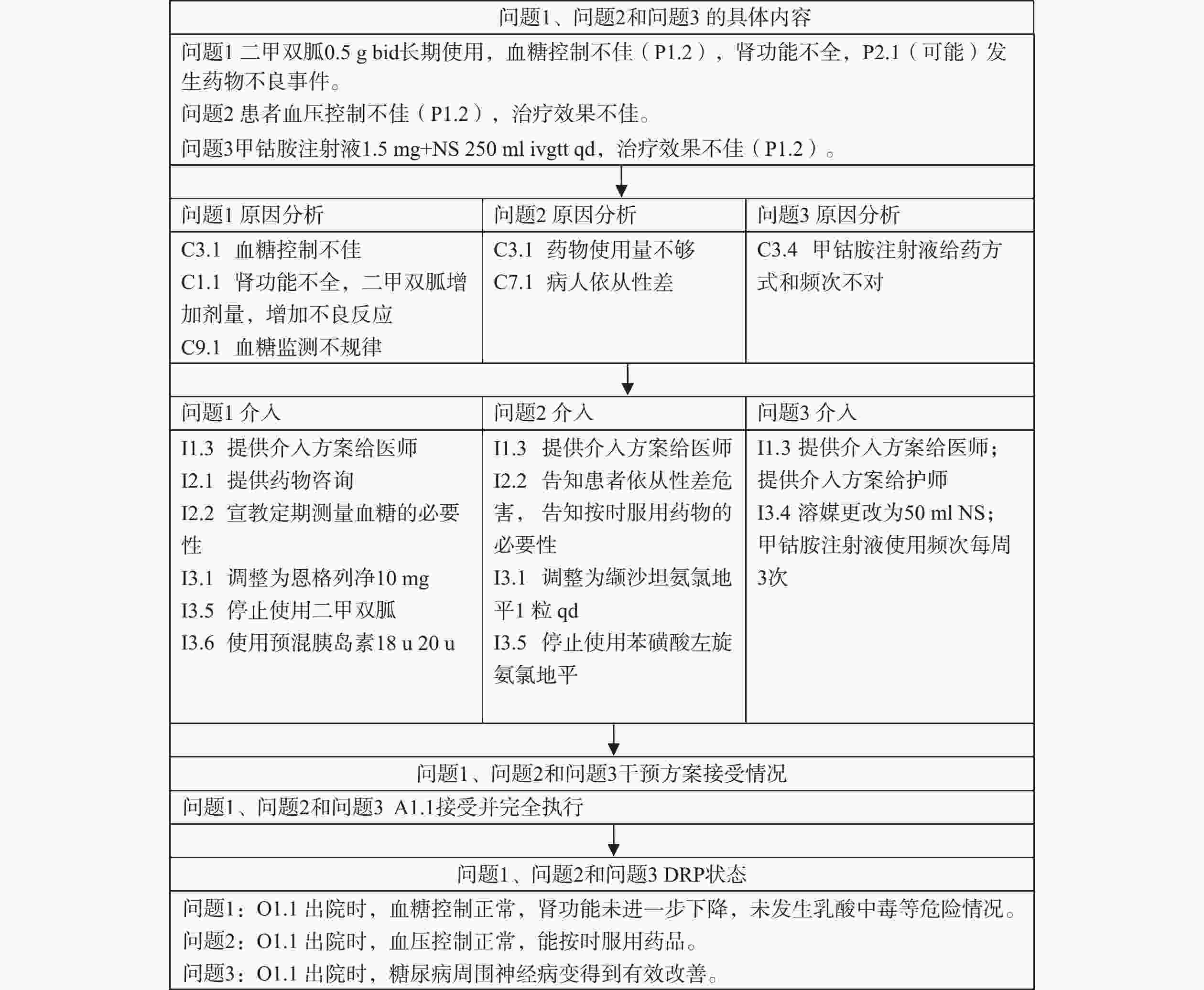 • 患者药物治疗方案存在3个问题,根据PCNE进行DRPs分类,如图2。问题1:患者糖尿病肾病,血糖控制不佳,且肾功能进行性下降,继续使用二甲双胍对患者存在风险(P2.1),需要调整降糖治疗方案。问题2:患者血压控制不佳,需要对血压控制方案进行调整(P1.2)。问题3:甲钴胺注射液+NS 250 ml ivgtt qd,治疗效果不佳(P1.2)。对DRPs进行原因分析,出现问题1的原因为患者血糖控制不佳(C3.1),肾功能下降,需要调整二甲双胍治疗(C1.1),没有规律血糖监测(C9.1)。出现问题2的原因为降压药物使用量过低(C3.1)。出现问题3的原因为甲钴胺注射液给药方式和频次不对(C3.4),肌内注射或静脉注射,tiw,甲钴胺见光易分解,开封后应立即使用,注意避光。