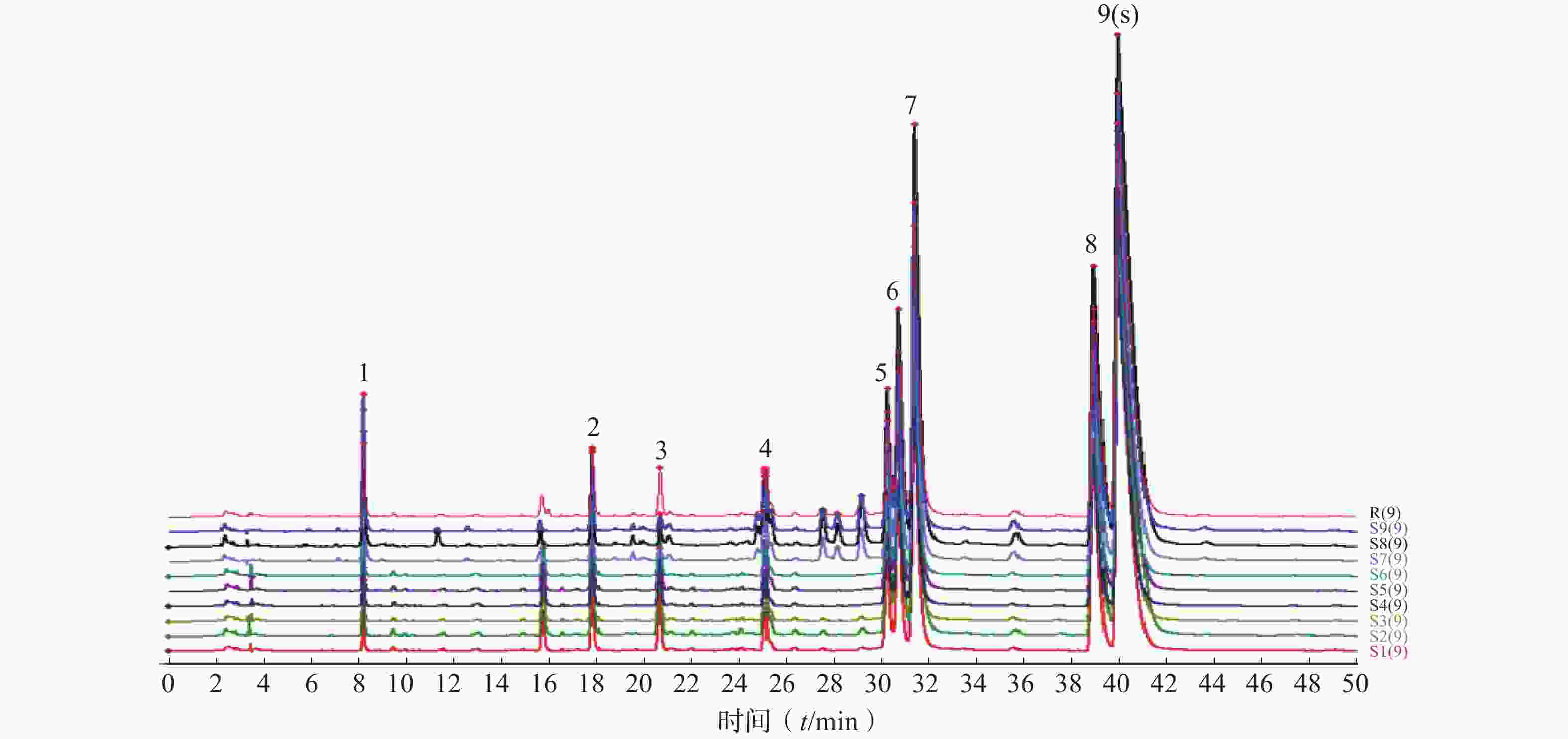 取混合对照品溶液及9组提取物供试品溶液,按照上述色谱条件依次进样,记录色谱图。采用国家药典委员会《中药色谱指纹图谱相似度评价系统》(2012年版)进行数据分析匹配,采取中位数法建立对照指纹图谱(R),见图1,通过与混合对照品溶液HPLC图谱(图2)比对,结合光谱图分析,确认4号峰为阿魏酸、6号峰为盐酸表小檗碱、7号峰为盐酸药根碱、8号峰为盐酸巴马汀、9号峰为盐酸小檗碱。计算各组黄连提取物溶液指纹图谱与对照指纹图谱的相似度,结果表明,各指纹图谱相似度在0.990~1之间,相似度良好,结果见表1。
