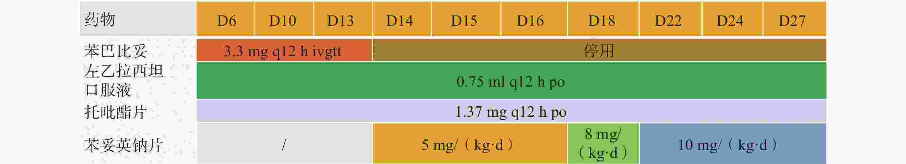 入院第6天,患儿出现癫痫发作,予以苯巴比妥注射液6 mg q12 h ivgtt治疗3 d后仍有癫痫发作,加用左乙拉西坦0.75 ml q12 h po治疗,完善辅助检查显示:血氨43.7 μmol/L,胸片提示左肺透亮度减低,心脏彩超提示房间隔缺损(Ⅱ孔、多孔型),头颅MRI提示左侧侧脑室前角盘小出血灶,视频脑电图提示爆发抑制,诊断为大田原综合征。针对大田原综合征,临床医生初始给药方案为口服左乙拉西坦口服液0.75 ml q12 h、托吡酯片1.37 mg q12 h及苯巴比妥片3.3 mg q12 h联合抗癫痫治疗。