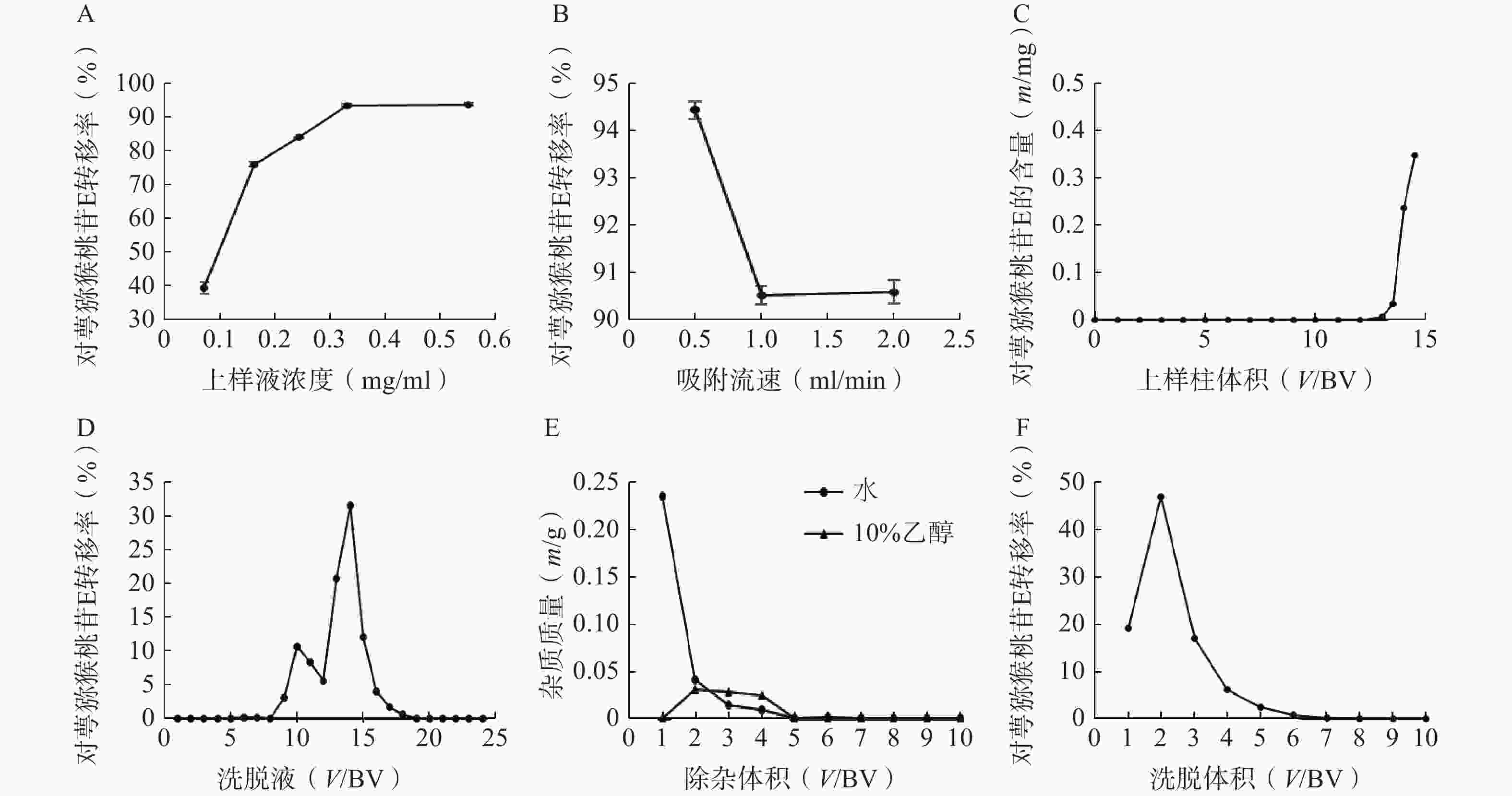 称取3份已处理的D101大孔树脂20 g,湿法装柱,量取浓度为0.55 mg/ml的上样液5 ml,分别以0.5、1、2 ml/min的流速上柱吸附,完全吸附后加3 BV水除杂,3 BV 95%乙醇洗脱,收集洗脱液,测定对萼猕猴桃苷E的量。结果表明,吸附流速增大,对萼猕猴桃苷E的转移率下降(图3B),故选择0.5 ml/min作为合适的吸附流速。