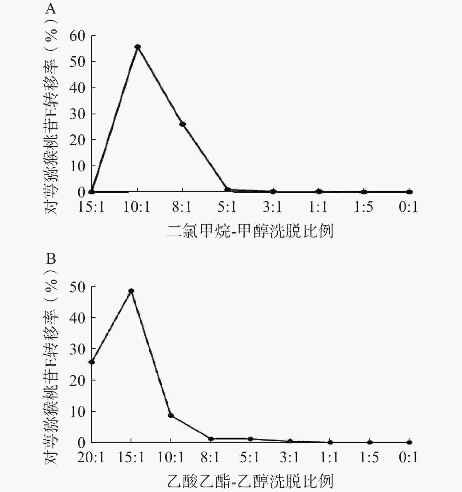 2)乙酸乙酯-乙醇洗脱系统的考察:依次用乙酸乙酯-乙醇20∶1、15∶1、10∶1、8∶1、5∶1、3∶1、1∶1、1∶5、0∶1洗脱,其余步骤同上。结果显示,对萼猕猴桃苷E在10∶1条件下基本已完全洗脱(图4B),因此可选择乙酸乙酯-乙醇洗脱系统10∶1洗脱5 BV。