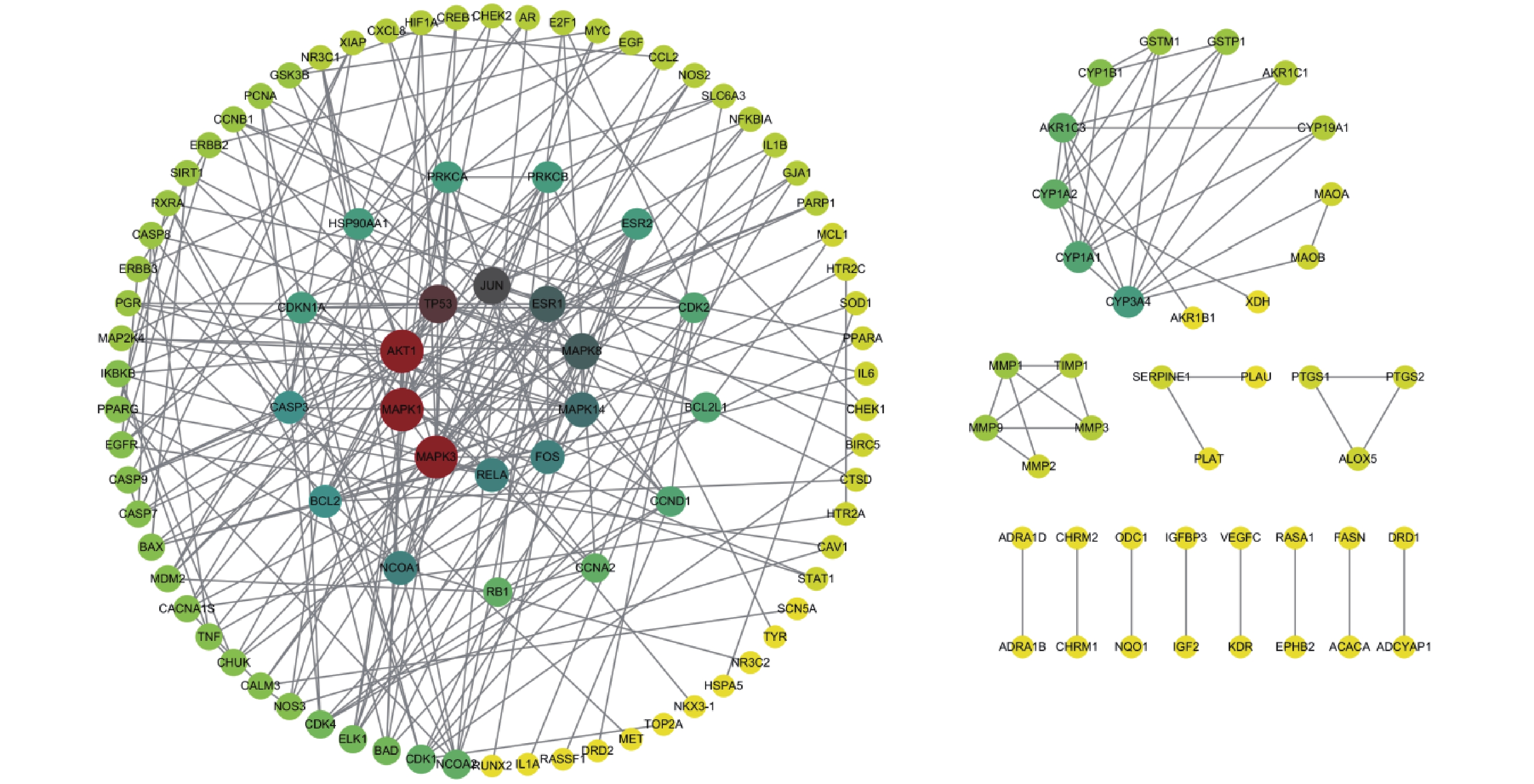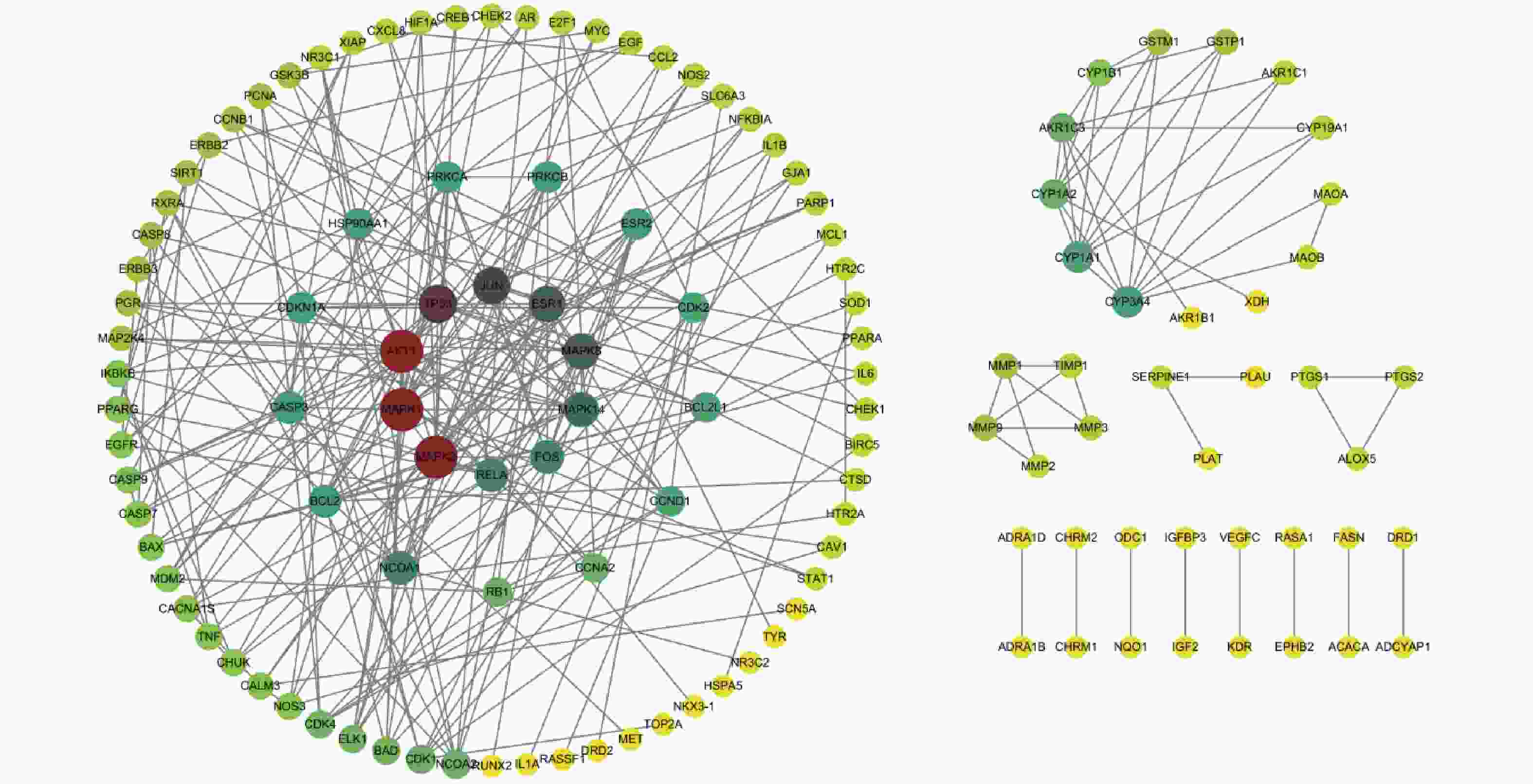 模块 Mcode分值 节点/边 基因 模块1 7.429 8/26 ESR1,MAPK1,MAPK8,MAPK14,FOS,MAPK3,JUN,ESR2 模块2 4 9/16 CDK4,ELK1,PRKCA,CDK2,CDKN1A,CASP3,CCND1,PCNA,PRKCB 模块3 4 4/6 ERBB3,EGF,EGFR,ERBB2 模块4 4 4/6 MMP3,MMP9,MMP1,TIMP1 模块5 3.667 13/22 PARP1,TNF,BCL2,AKT1,RELA,NFKBIA,IKBKB,TP53,CASP9,BAX,CASP7,CHUK,XIAP 模块6 3.333 4/5 GSTP1,CYP1A1,GSTM1,CYP1A2 模块7 3 3/3 MAOA,MAOB,CYP3A4 模块8 3 3/3 PTGS2,ALOX5,PTGS1 -