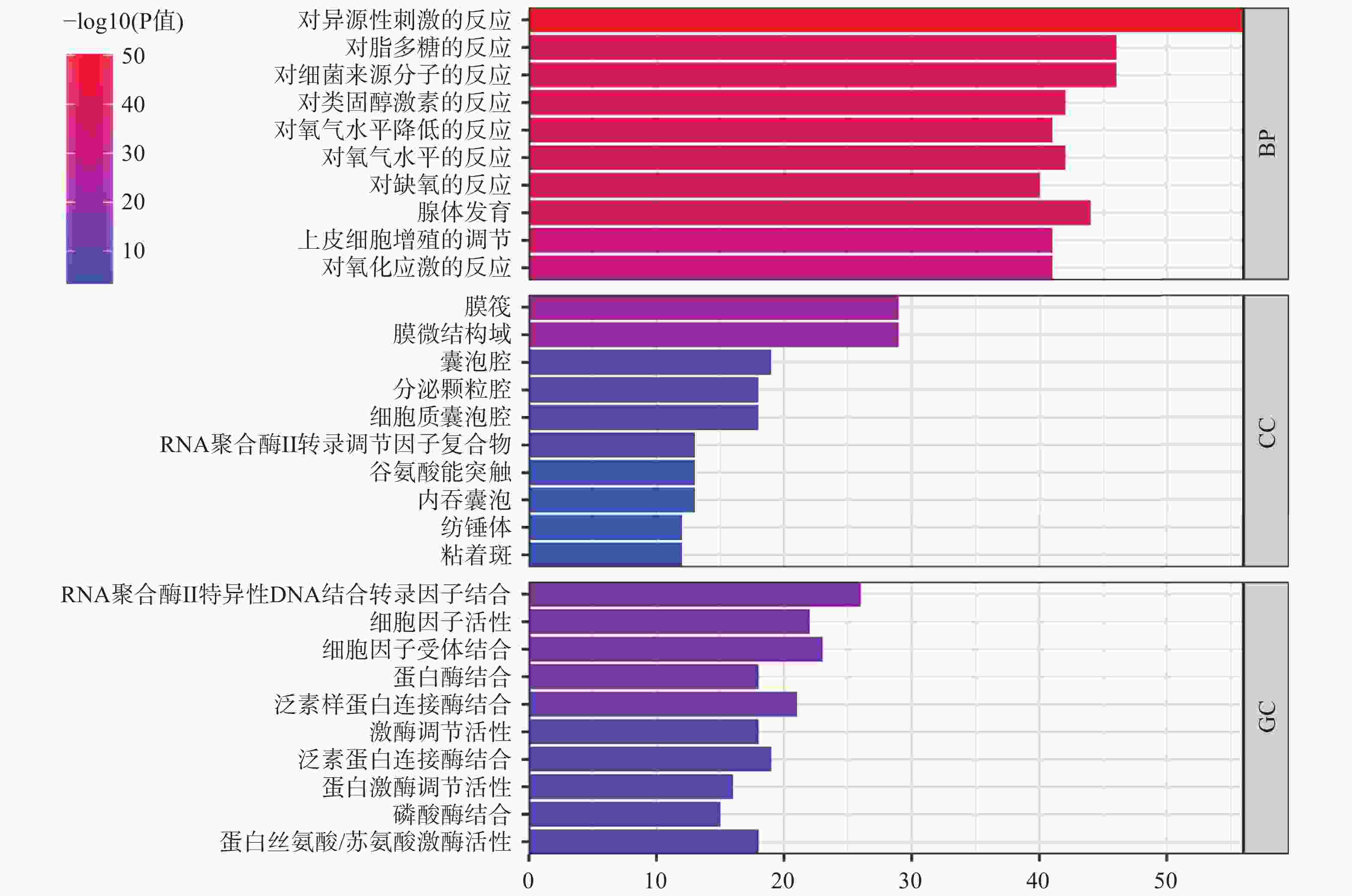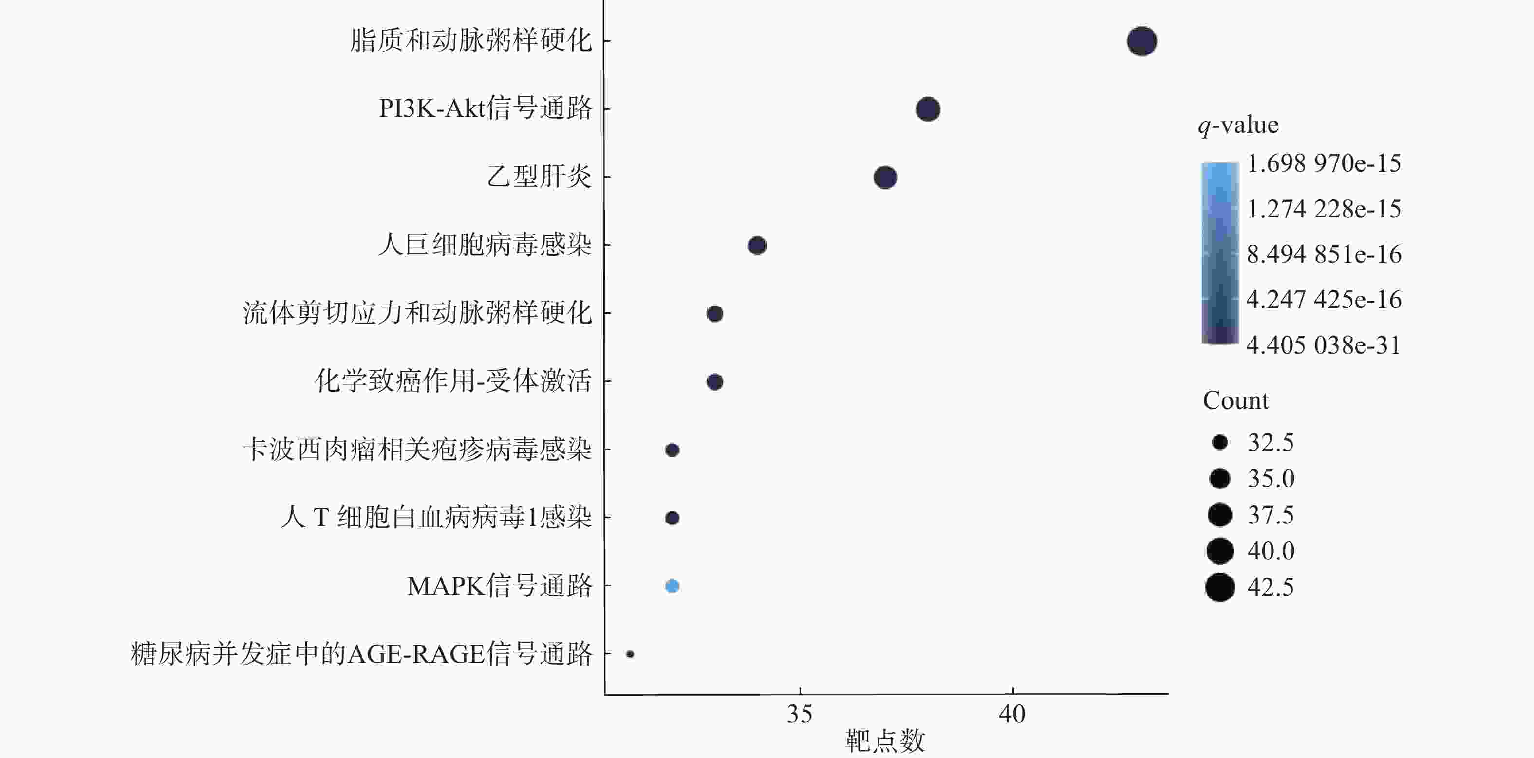 使用R 4.3.2软件,对药物-疾病共有靶点进行GO生物学功能分析,其中有2005个生物过程,151个分子功能,63个细胞组件,根据P<0.05,对所涉及靶点数目进行排序,选出排名前10条目绘制条形图(图3)。对药物-疾病靶点进行KEGG通路分析,共涉及181条通路,根据P<0.05,选出前10的条目绘制气泡图(图4)。