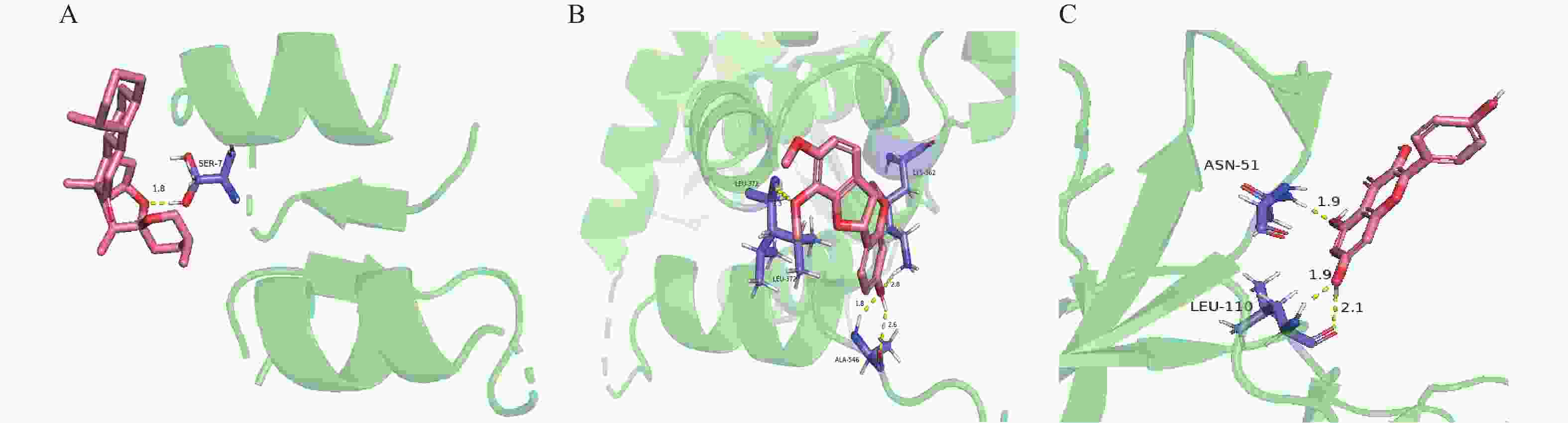 为检验所筛选核心靶点的精确性,从PDB数据库(https://www.rcsb.org/)查找核心靶点蛋白的三维结构文件;从Pubchem数据库(https://pubchem.ncbi.nlm.nih.gov/)检索和核心靶点对应的药物活性成分的三维结构文件。应用Autodock软件计算结合能,并使用PyMOL软件将结合力较好的靶点蛋白-药物活性成分预测三维结构进行可视化展示。