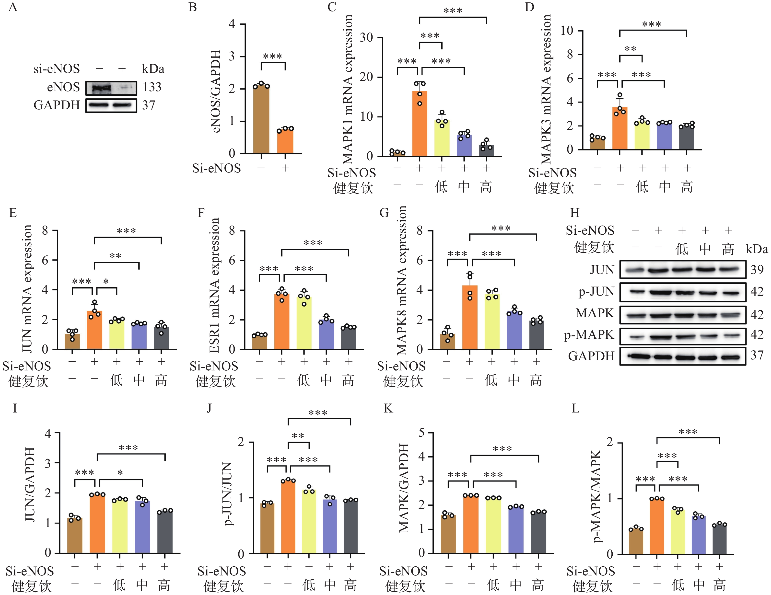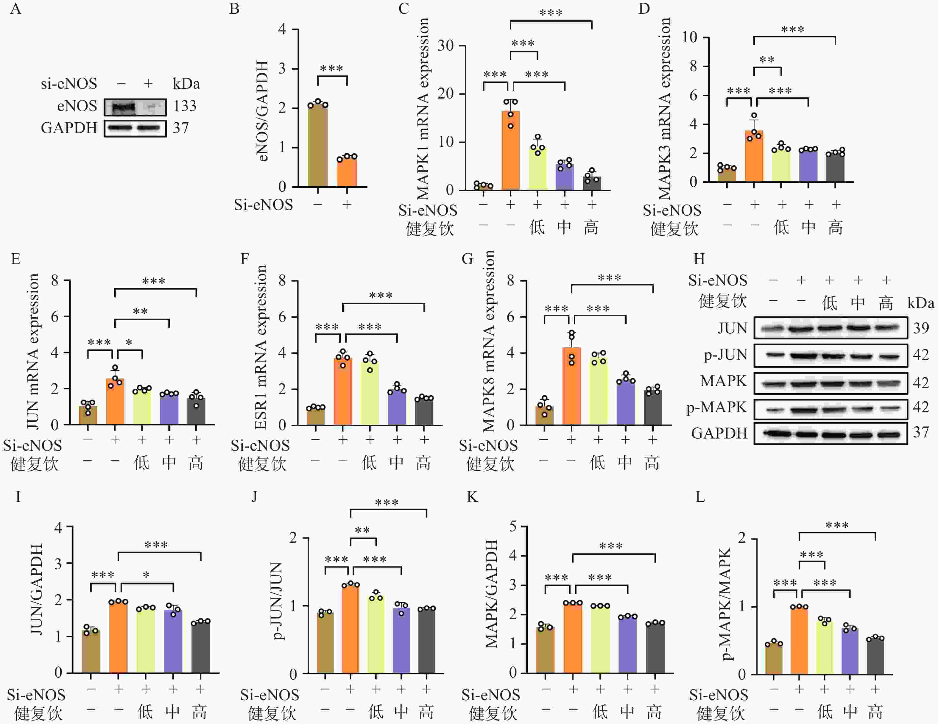 ED的主要表现为内皮功能障碍,因此我们使用小干扰RNA沉默HUVEC的eNOS基因,制备内皮细胞功能障碍模型,以此研究健复饮治疗ED的机制。我们将Si-eNOS RNA转染HUVEC细胞48 h后,提取总蛋白,利用WB检测eNOS蛋白的表达,结果发现eNOS蛋白表达降低,表明内皮功能障碍模型制备成功。接着,我们使用低、中、高三种浓度的健复饮(2.5、10、20 g/L)孵育Si-eNOS RNA转染的HUVEC细胞24 h后提取总RNA,利用QPCR检测发现,健复饮显著抑制内皮功能障碍细胞模型的MAPK1、MAPK3、JUN、ESR1、MAPK8基因表达。同时我们利用WB检测发现内皮功能障碍细胞模型MAPK和JUN蛋白的磷酸化显著增强,健复饮有效抑制MAPK和JUN蛋白的磷酸化(图6)。