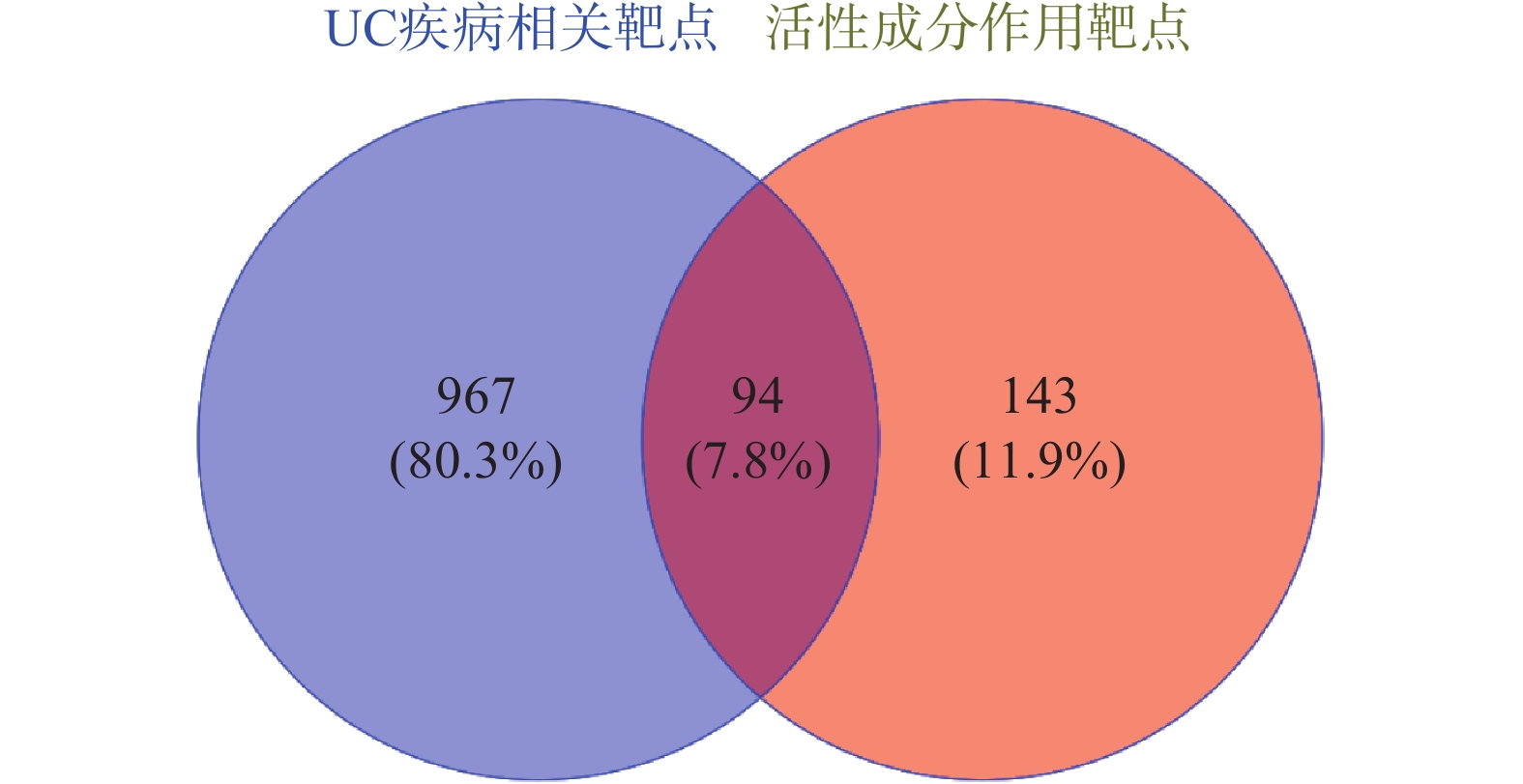 • 应用TCMSP和HIT数据库检索愈肠颗粒活性成分和作用靶点,基于OB、DL条件筛选,删去重复值,共获取98个活性成分及 237个作用靶点;使用GeneCards、CTD和DisGeNET数据库检索筛选共获得UC疾病靶点1061个;应用Venny2.1.0可视化平台绘制维恩图,获取二者交集靶点。结果如图1所示,愈肠颗粒与UC的交集靶点共94个,这表明愈肠颗粒可通过多靶点作用于UC。