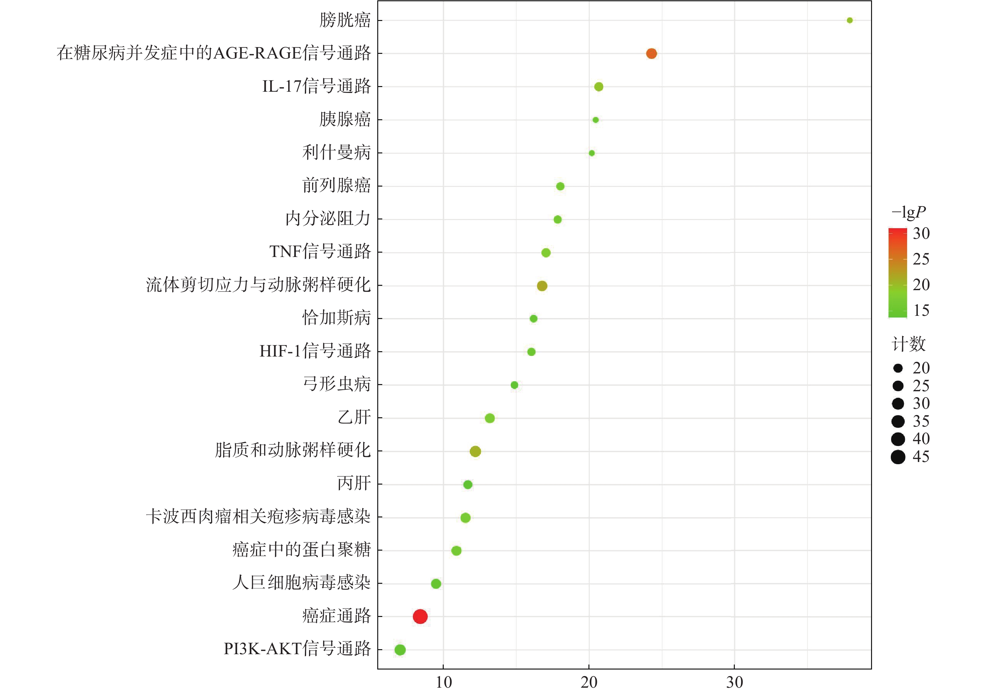 • 应用David网站对交集靶点进行GO和KEGG通路富集分析,共获得611个生物过程、50个细胞组分、104 个分子功能和158 条信号通路。利用微生信在线平台分析P值前10位BP、CC、MF条目,并进行可视化。结果如图4所示,BP主要涉及基因表达正向调控、应激、细胞凋亡的负向调控等条目,CC主要涉及细胞外隙、细胞外区域、大分子复合物等条目,MF主要涉及酶结合位点、相同蛋白质结合、蛋白结合等条目。同理,选取P值取前20位KEGG的条目进行可视化分析,结果表明癌症、AGE-RAGE在糖尿病并发症中的作用、脂质和动脉粥样硬化、IL-17和TNF信号通路等条目是愈肠颗粒治疗UC的主要通路等条目,具体见图5。这表明,愈肠颗粒可以通过多细胞组分、多分子功能、多生物学过程和多信号通路作用于UC。