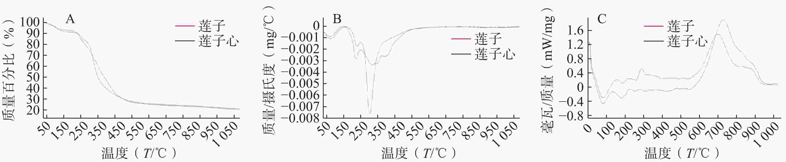 • 莲子和莲子心药材分别研磨,过120目筛,各精密称取粉末12.0 mg,设置温度范围为30~1 100 ℃,升温速率10 ℃/min,测试气氛Ar,流速50 ml/min,测试坩埚:70 μl铂金套陶瓷坩埚。